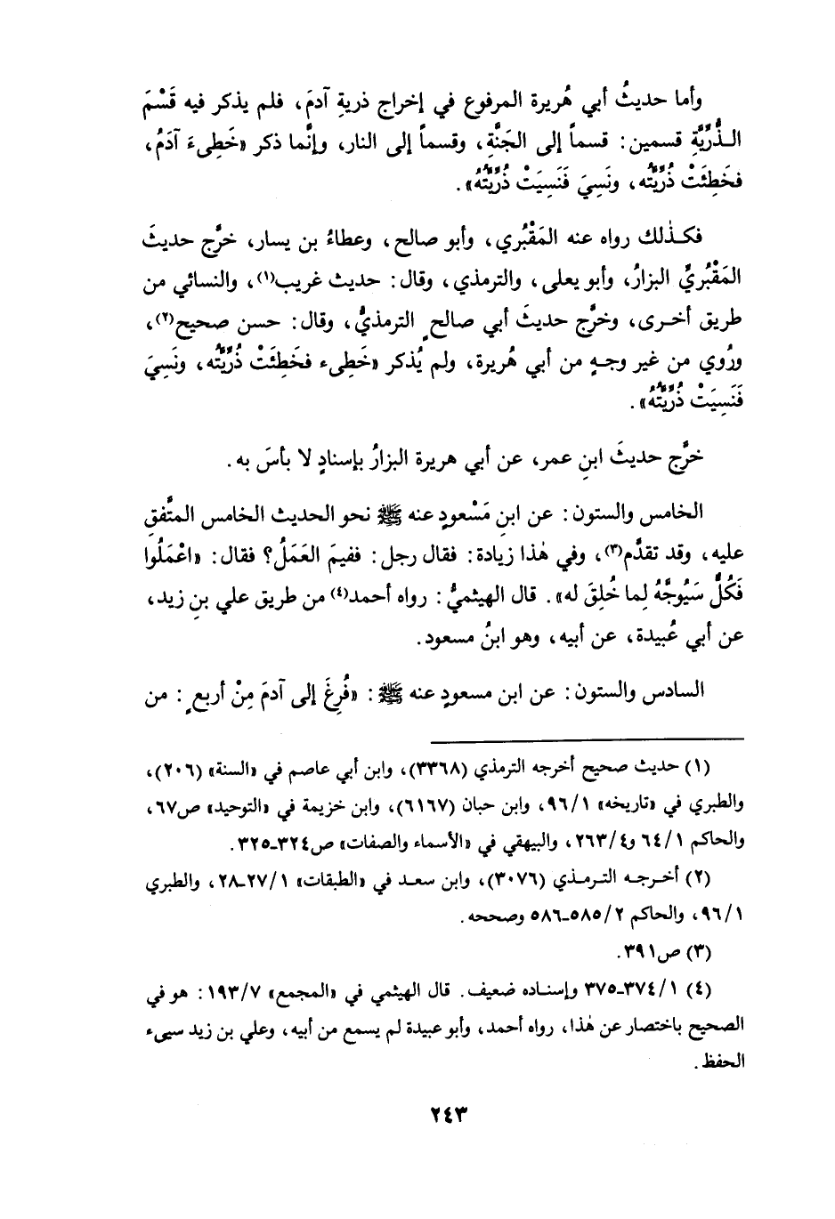وأما حديث أبي هريرة المرفوع في إخراج ذرية آدم، فلم يذكر فيه قَسْمَ الذُّرِّيَّة قسمين: قسماً إلى الجنة، وقسماً إلى النار، وإنما ذكر " خَطِىءَ آدم، فخَطِئَتْ ذُرِّيَّتُه، ونَسِيَ فنسيَتْ ذُرِّيَّتُهُ ".