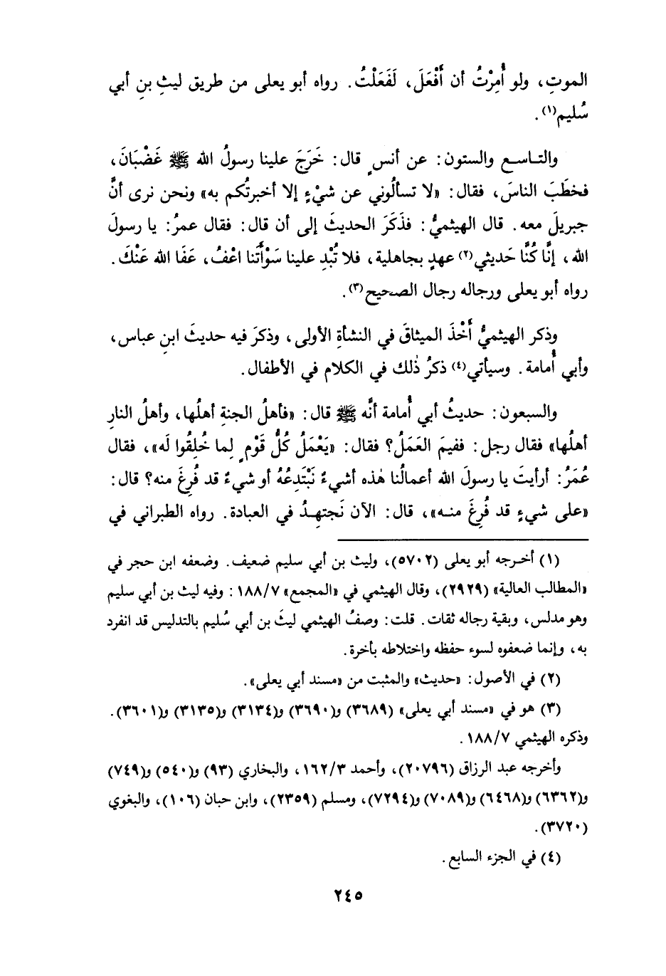 الموت، ولو أُمِرْتُ أن أفعل، لفعلتُ. رواه أبو يعلى من طريق ليث بن أبي سليم (¬1).