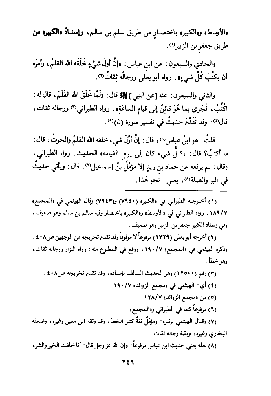 قلت: هو ابن عباس (¬6)، قال: إن أول شيء خلقه الله القلمُ والحوتُ، قال: ما أكتب؟ قال: " كلُّ شيء كان إلى يوم القيامة " الحديث. رواه الطبراني، وقال: لم يرفعه عن حماد بن زيد إلاَّ مؤمَّل بن إسماعيل (¬7). قال: ويأتي حديث في البر والصلة (¬8)، يعني: نحو هذا.