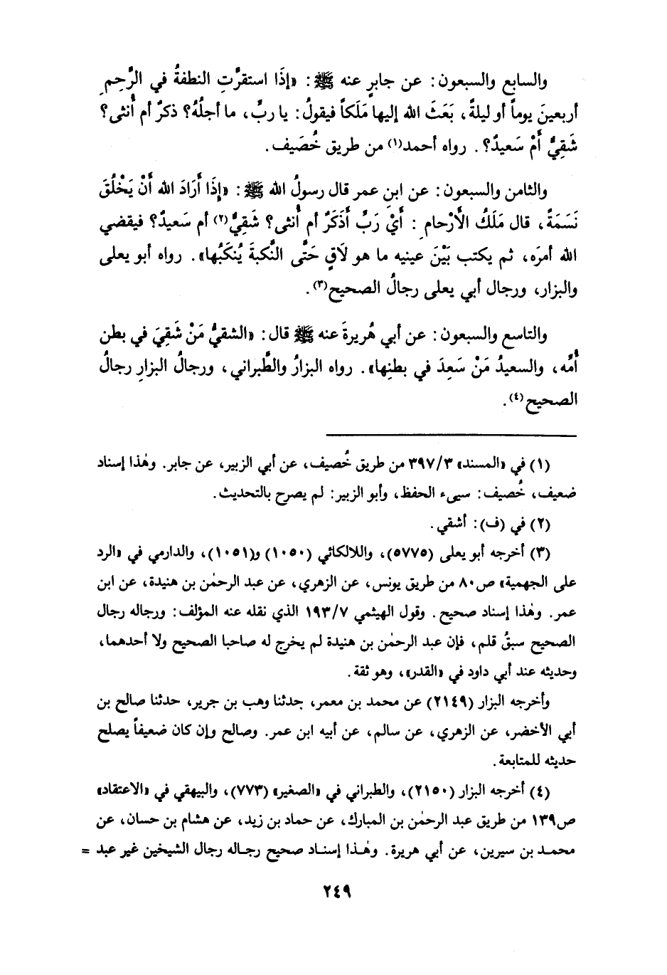 والسابع والسبعون: عن جابرٍ عنه - صلى الله عليه وسلم -: " إذا استقرَّت النطفة في الرحم أربعين يوماً أو ليلةً، بعث الله إليها مَلَكاً فيقول: يا رب، ما أجلُهُ؟ ذكرٌ أم أنثى؟ شقيٌّ أم سعيد؟. رواه أحمد (¬1) من طريق خُصَيف.