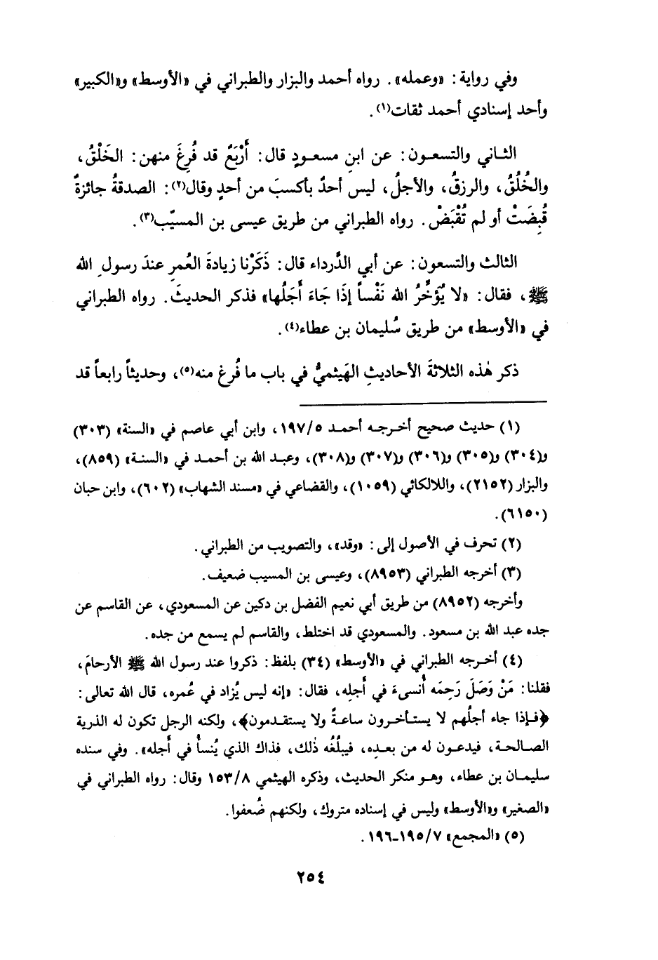 الثالث والتسعون: عن أبي الدرداء قال: ذكرنا زيادة العمر عند رسول الله - صلى الله عليه وسلم -، فقال: " لا يُؤَخِّرُ الله نفساً إذا جاء أجلها " فذكر الحديث. رواه الطبراني في " الأوسط " من طريق سليمان بن عطاء (¬4).