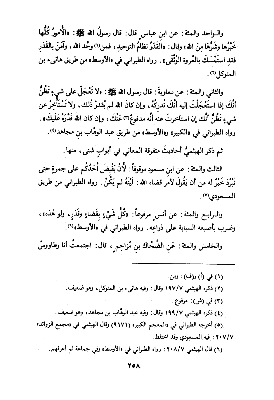 والواحد والمئة: عن ابن عباس قال: قال رسول الله - صلى الله عليه وسلم -: " الأُمورُ كُلُّها خيرها وشرها من الله " وقال: " القَدَرُ نظام التوحيد، فمن (¬1) وحَّد الله، وآمن بالقدر فقد استمسك بالعُروة الوُثقى ". رواه الطبراني في " الأوسط " من طريق هانىء بن المتوكل (¬2).