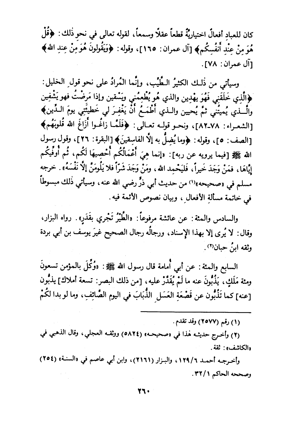 وسيأتي من ذلك الكثير الطَّيِّب، وإنما المراد على نحو قول الخليل: {الَّذِي خَلَقَنِي فَهُوَ يَهْدِينِ (78) وَالَّذِي هُوَ يُطْعِمُنِي وَيَسْقِينِ (79) وَإِذَا مَرِضْتُ فَهُوَ يَشْفِينِ (80) وَالَّذِي يُمِيتُنِي ثُمَّ يُحْيِينِ (81) وَالَّذِي أَطْمَعُ أَنْ يَغْفِرَ لِي خَطِيئَتِي يَوْمَ الدِّينِ} [الشعراء: 78 - 82]، ونحو قوله تعالى: {فَلَمَّا زَاغُوا أَزَاغَ اللَّهُ قُلُوبَهُمْ} [الصف: 5]، وقوله: {وما يُضِلُّ به إلاَّ الفاسِقينَ} [البقرة: 26]، وقول رسول الله - صلى الله عليه وسلم -[فيما يرويه عن ربه]: " إنما هي أعمالُكُم أُحْصِيهَا لكم، ثم أُوفِّيكُم إياها، فمن وجد خيراً، فليحمد الله، ومن وجد شراً فلا يَلُومَنَّ إلاَّ نفسه ". خرجه مسلم في " صحيحه " (¬1) من حديث أبي ذرٍّ رضي الله عنه، وسيأتي ذلك مبسوطاً في خاتمة مسألة الأفعال، وبيان نصوص الأئمة فيه.