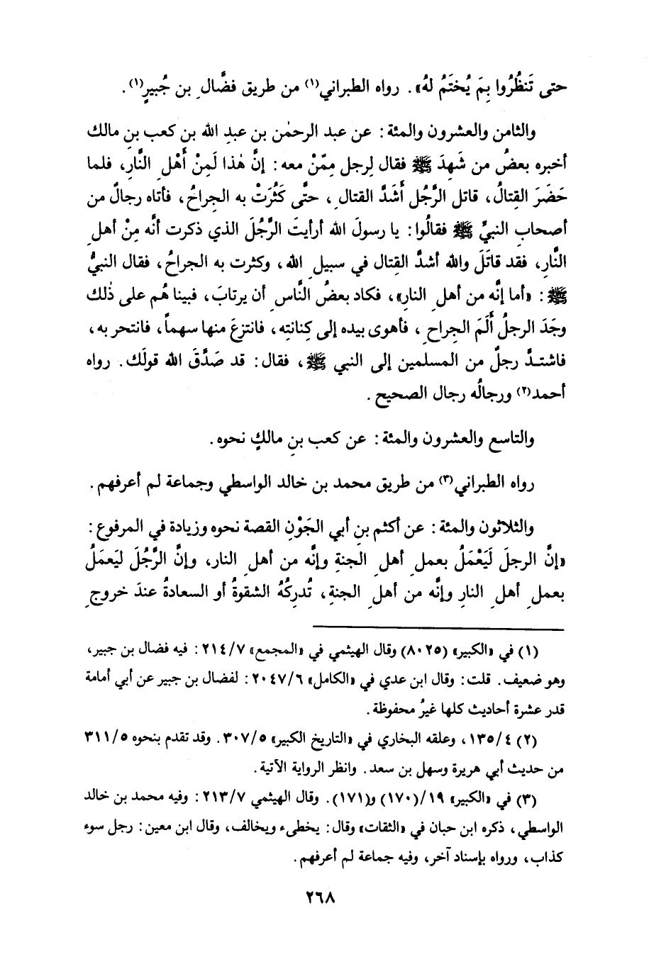 والثامن والعشرون والمئة: عن عبد الرحمن بن عبد الله بن كعب بن مالك أخبره بعض من شهد - صلى الله عليه وسلم - فقال لرجل ممن معه: إن هذا لَمِنْ أهل النار، فلما حضر القتال، قاتل الرجل أشد القتال، حتَّى كثرت به الجراح، فأتاه رجال من أصحاب النبي - صلى الله عليه وسلم - فقالوا: يا رسول الله أرأيت الرجل الذي ذكرت أنه من أهل النار، فقد قاتل والله أشد القتال في سبيل الله، وكثرت به الجراح، فقال النبي - صلى الله عليه وسلم -: " أما إنه من أهل النار "، فكاد بعض الناس أن يرتاب، فبينا هم على ذلك وجد الرجل ألم الجراح، فأهوى بيده إلى كِنانته، فانتزع منها سهماً، فانتحر به، فاشتد رجل من المسلمين إلى النبي - صلى الله عليه وسلم -، فقال: قد صدَّق الله قولك. رواه أحمد (¬2) ورجاله رجال الصحيح.