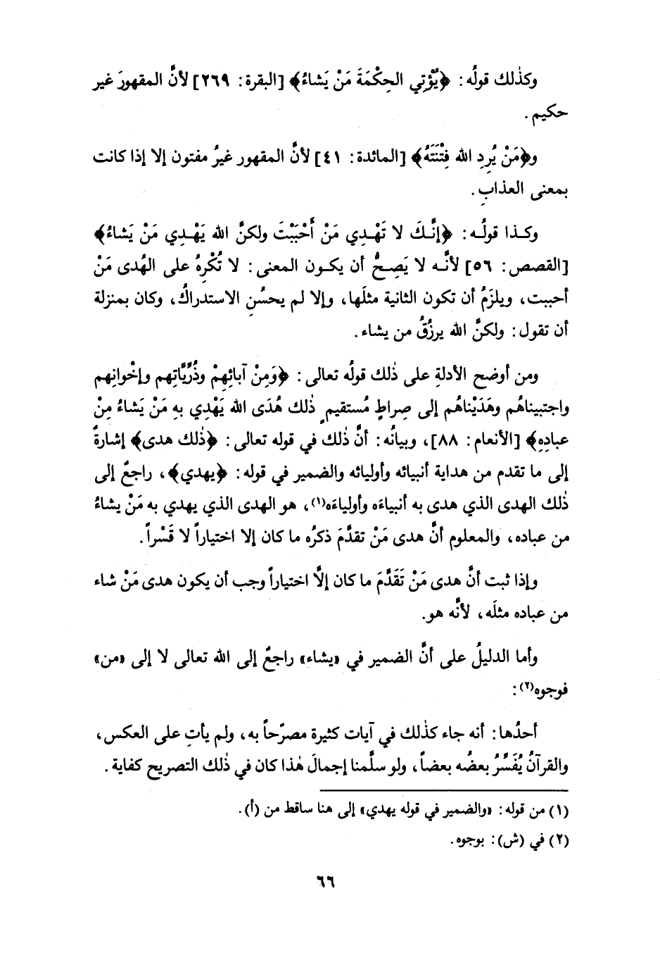 ومن أوضح الأدلة على ذلك قوله تعالى: {وَمِنْ آبَائِهِمْ وَذُرِّيَّاتِهِمْ وَإِخْوَانِهِمْ وَاجْتَبَيْنَاهُمْ وَهَدَيْنَاهُمْ إِلَى صِرَاطٍ مُسْتَقِيمٍ (87) ذَلِكَ هُدَى اللَّهِ يَهْدِي بِهِ مَنْ يَشَاءُ مِنْ عِبَادِهِ} [الأنعام: 87 - 88]، وبيانه: أن ذلك في قوله تعالى: {ذلك هدى} إشارة إلى ما تقدم من هداية أنبيائه وأوليائه والضمير في قوله: {يهدي}، راجعٌ إلى ذلك الهدى الذي هدى به أنبياءه وأولياءه (¬1)، هو الهدى الذي يهدي به من يشاء من عباده، والمعلوم أن هدى من تقدم ذكره ما كان إلاَّ اختياراً لا قسراً.