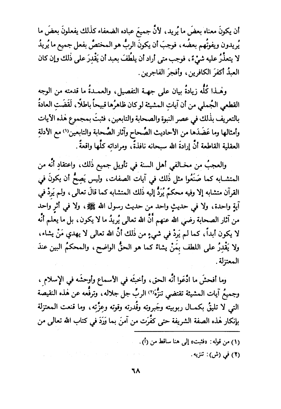 والعجب من مخالفي أهل السنة في تأويل جميع ذلك، واعتقاد أنه من المتشابه كما صنعوا مثل ذلك في آيات الصفات، وليس يصح أن يكون في القرآن متشابه إلاَّ وفيه محكمٌ يُرَدُّ إليه ذلك المتشابه كما قال تعالى، ولم يرد في آيةٍ واحدة، ولا في حديثٍ واحد من حديث رسول الله - صلى الله عليه وسلم -، ولا في أثرٍ واحد من آثار الصحابة رضي الله عنهم أن الله تعالى يريد ما لا يكون، بل ما يعلم أنه لا يكون أبداً، كما لم يَرِدْ في شيء من ذلك أن الله تعالى لا يهدي من يشاء، ولا يقدر على اللطف بمن يشاء كما هو الحق الواضح، والمحكم البين عند المعتزلة.