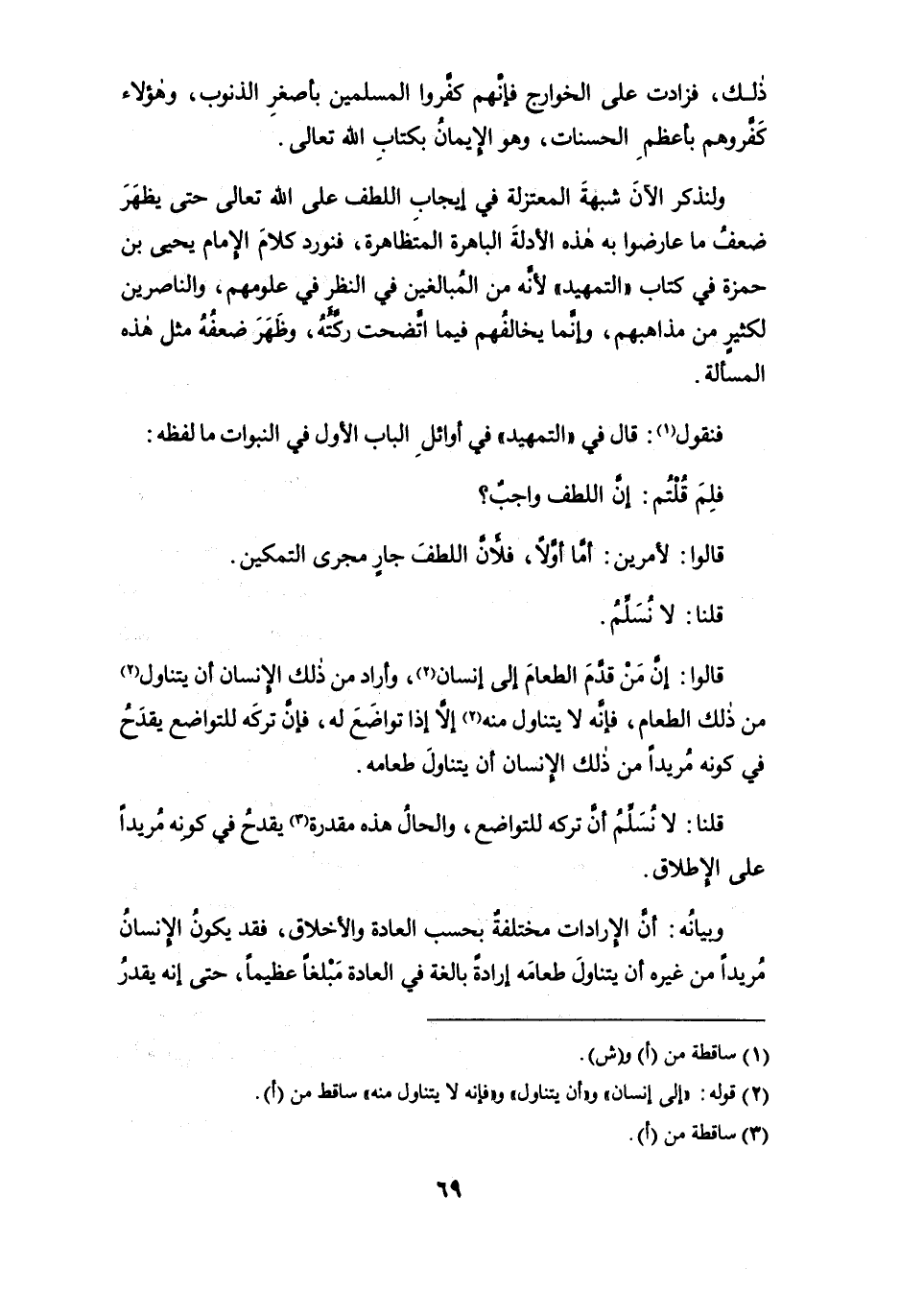 ولنذكر الآن شبهة المعتزلة في إيجاب اللطف على الله تعالى حتى يظهر ضعف ما عارضوا به هذه الأدلة الباهرة المتظاهرة، فنورد كلام الإمام يحيى بن حمزة في كتاب " التمهيد " لأنه من المُبالغين في النظر في علومهم، والناصرين لكثيرٍ من مذاهبهم، وإنما يخالفهم فيما اتَّضحت ركَّتهُ، وظهر ضعفه مثل هذه المسألة.