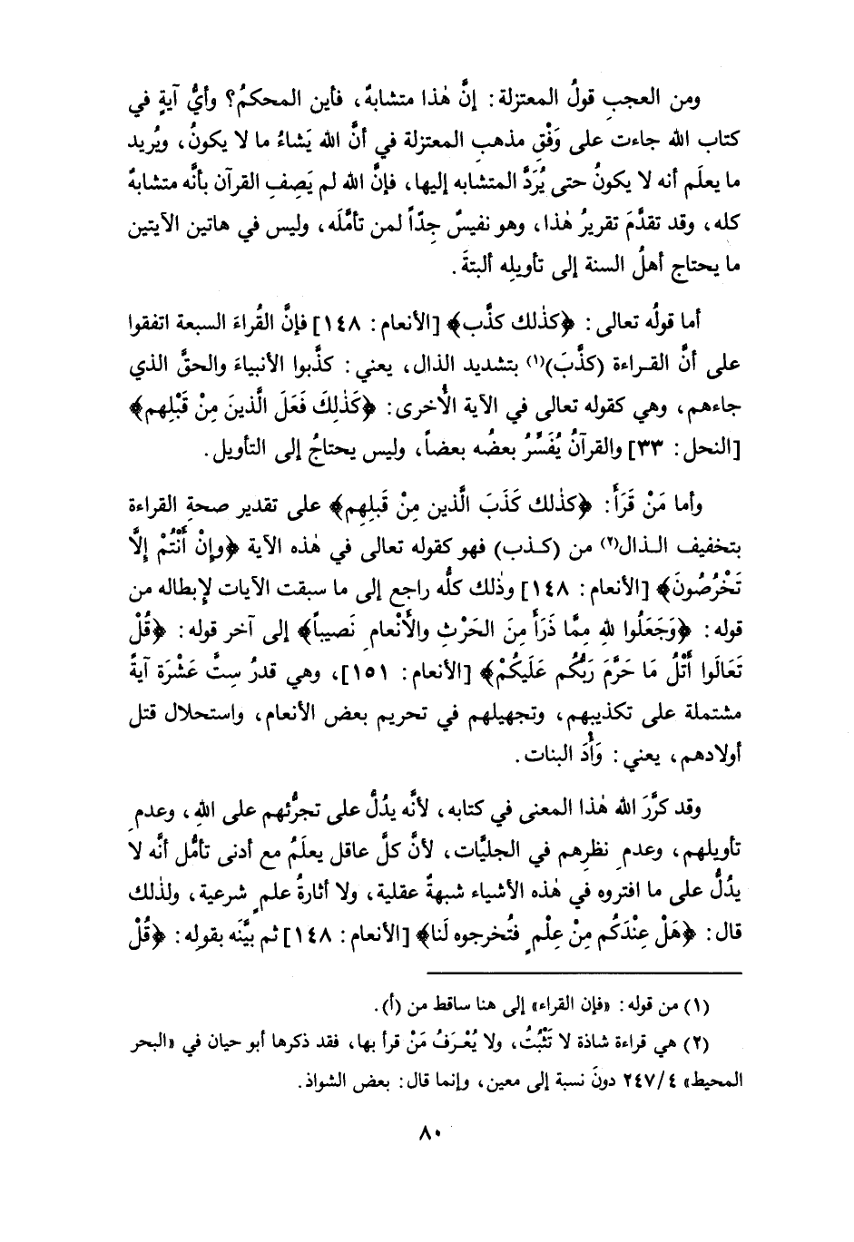 أما قوله تعالى: {كَذَلِكَ كذَّب} [الأنعام: 148] فإن القراء السبعة اتفقوا على أن القراءة (كذَّبَ) (¬1) بتشديد الذال، يعني: كذبوا الأنبياء والحق الذي جاءهم، وهي كقوله تعالى في الآية الأخرى: {كَذلِكَ فَعَلَ الَّذينَ مِنْ قَبْلِهم} [النحل: 33] والقرآن يُفَسِّرُ بعضه بعضاً، وليس يحتاج إلى التأويل.