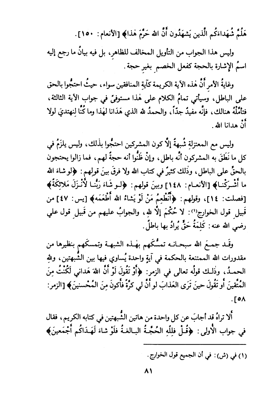 وليس مع المعتزلة شُبهةٌ إلاَّ كون المشركين احتجوا بذلك، وليس يلزم في كل ما نطق به المشركون أنه باطل، وإن ظنوا أنه حجةٌ لهم، فما زالوا يحتجون بالحق على الباطل، وذلك كثيرٌ في كتاب الله ولا فرق بين قولهم: {لو شاءَ الله ما أَشْركْنا} [الأنعام: 148] وبين قولهم: {لو شَاءَ رَبُّنا لأنْزَلَ مَلائِكَةً} [فصلت: 14]، وقولهم: {أَنُطْعِمُ مَنْ لَوْ يَشاءُ الله أطْعَمَه} [يس: 47] من قبيل قول الخوارج (¬1): لا حكم إلاَّ لله، والجواب عليهم من قبيل قول علي رضي الله عنه: كلمة حق يراد بها باطل.