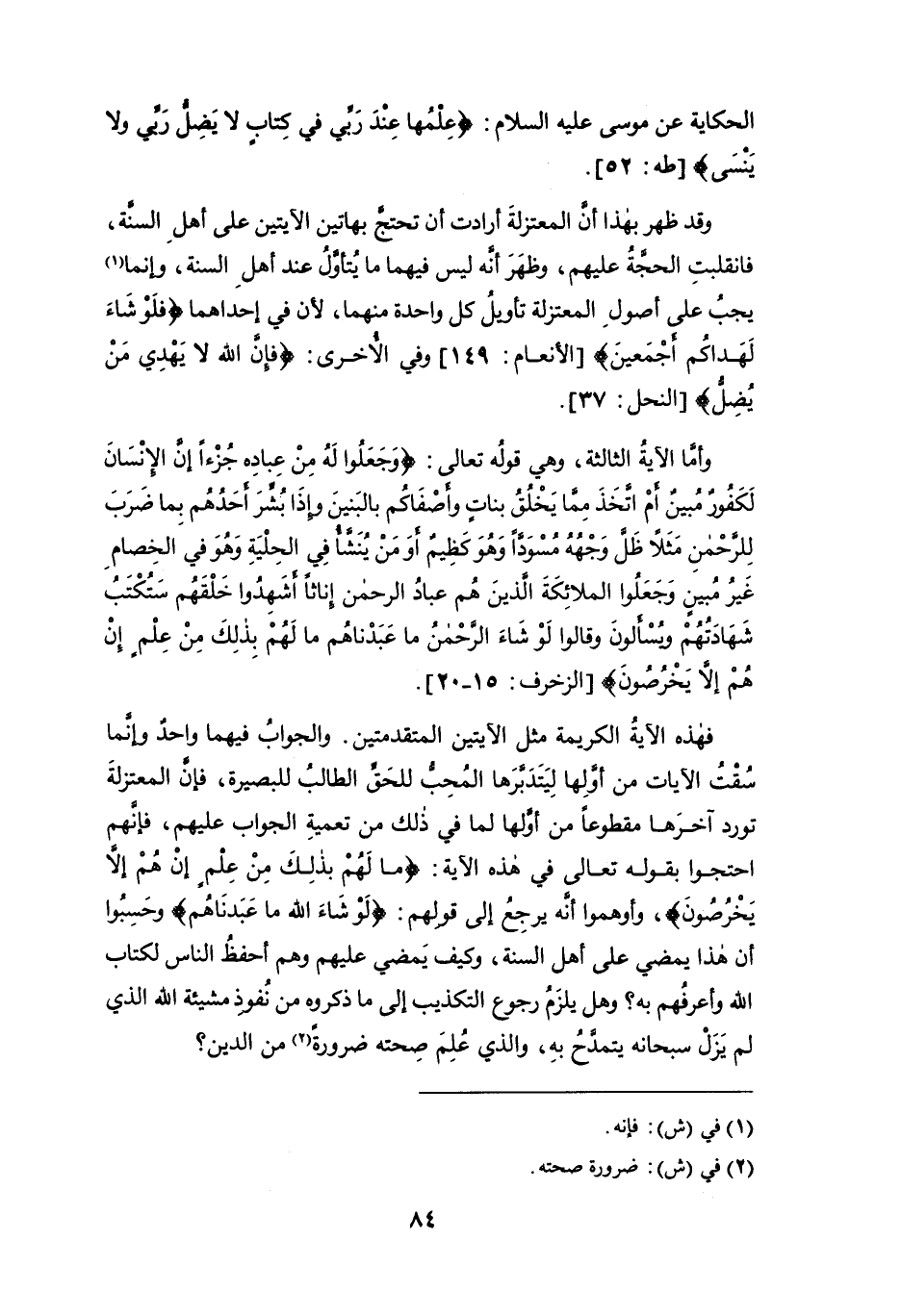 فهذه الآية الكريمة مثل الآيتين المتقدمتين. والجواب فيهما واحد وإنما سُقْتُ الآيات من أولها ليتدبرها المحب للحق الطالب للبصيرة، فإن المعتزلة تورد آخرها مقطوعاً من أولها لما في ذلك من تعمية الجواب عليهم، فإنهم احتجوا بقوله تعالى في هذه الآية. {مَا لَهُمْ بِذَلِكَ مِنْ عِلْمٍ إِنْ هُمْ إِلَّا يَخْرُصُونَ}، وأوهموا أنه يرجع إلى قولهم: {لَوْ شَاءَ الرَّحْمَنُ مَا عَبَدْنَاهُمْ} وحَسِبوا أن هذا يمضي على أهل السنة، وكيف يمضي عليهم وهم أحفط الناس لكتاب الله وأعرفهم به؟ وهل يلزم رجوع التكذيب إلى ما ذكروه من نفوذ مشيئة الله الذي لم يزل سبحانه يتمدح به، والذي عُلِمَ صحته ضرورةً (¬2) من الدين؟