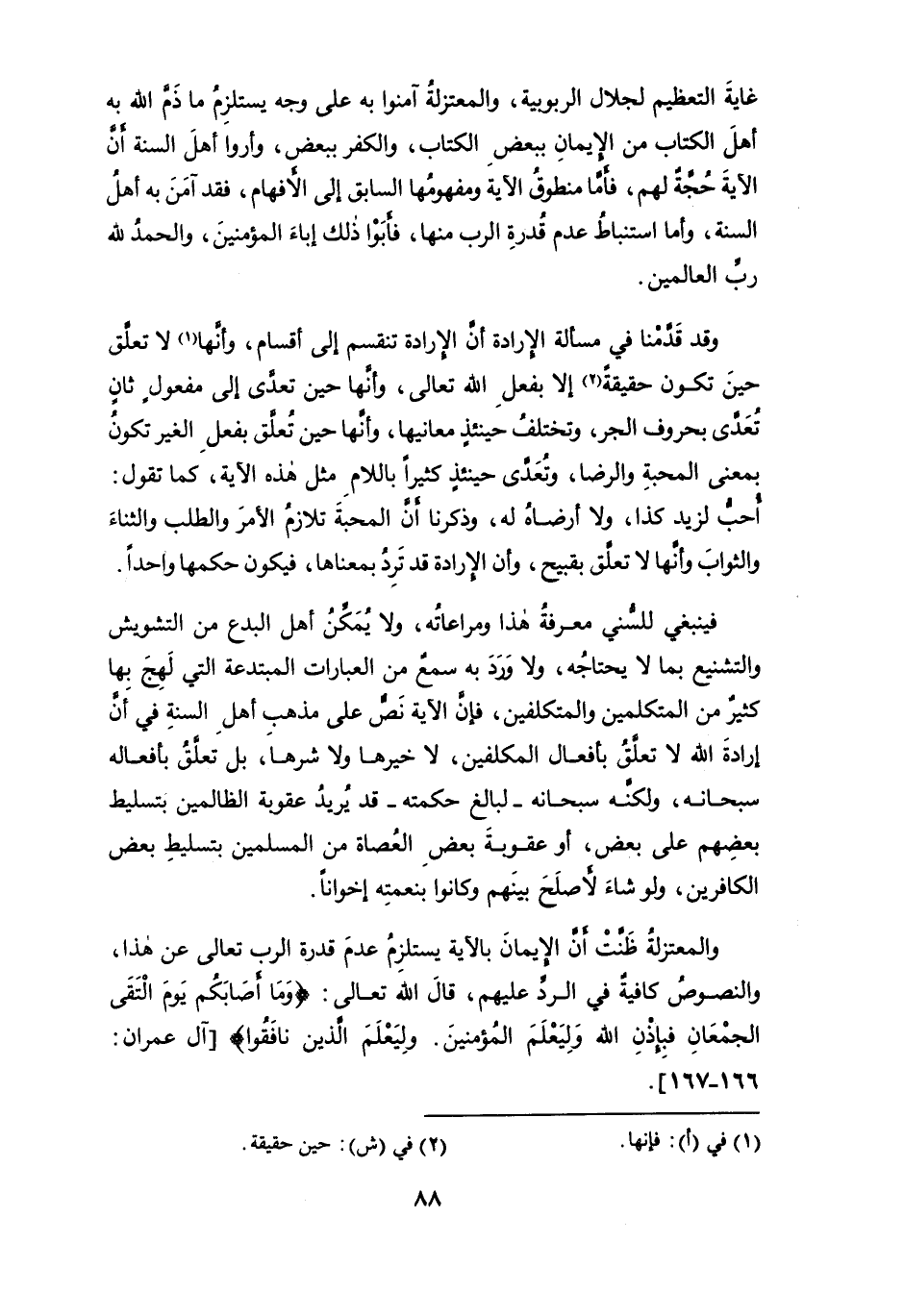 غاية التعظيم لجلال الربوبية، والمعتزلة آمنوا به على وجه يستلزم ما ذم الله به أهل الكتاب من الإيمان ببعض الكتاب، والكفر ببعض، وأروا أهل السنة أن الآية حجة لهم، فأمَّا منطوق الآية ومفهومها السابق إلى الأفهام، فقد آمن به أهل السنة، وأما استنباط عدم قدرة الرب منها، فأبَوْا ذلك إباء المؤمنين، والحمد لله رب العالمين.