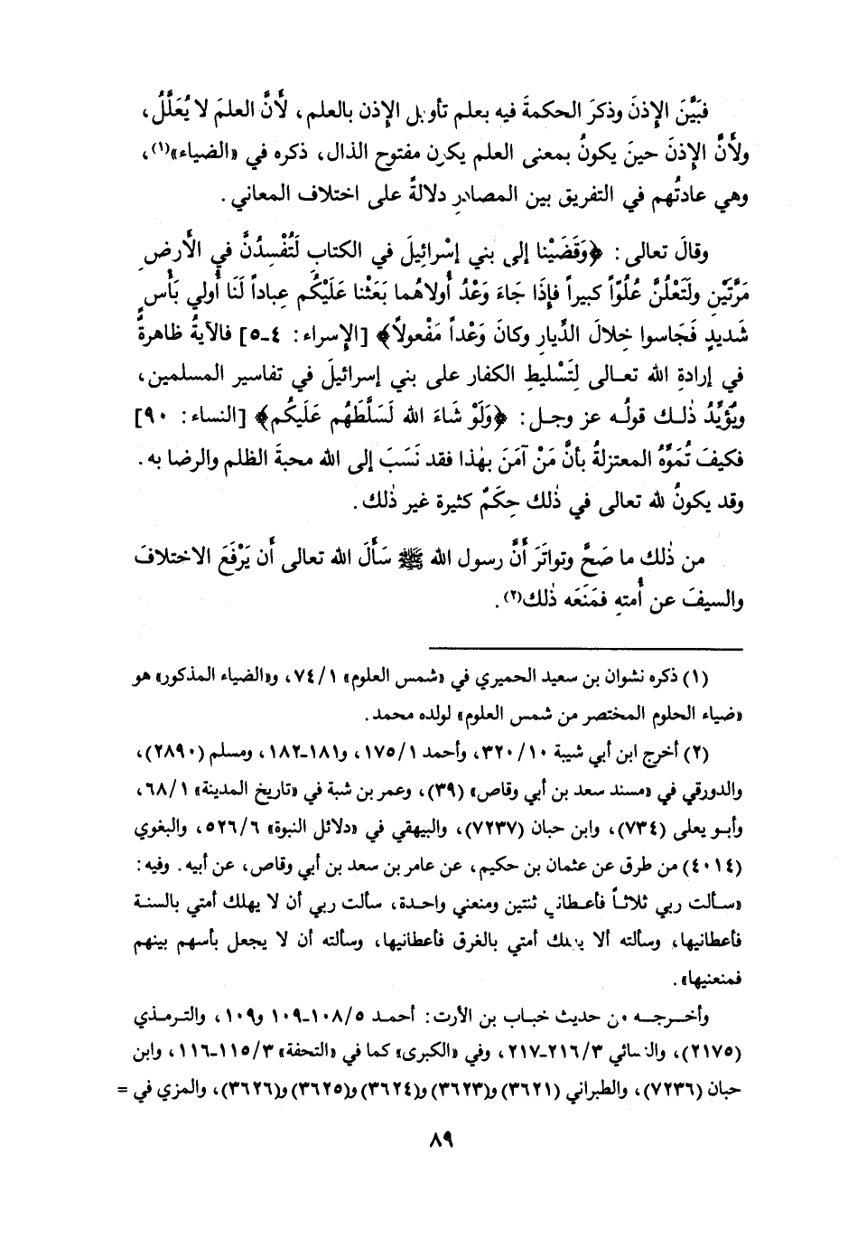 وقال تعالى: {وَقَضَيْنَا إِلَى بَنِي إِسْرَائِيلَ فِي الْكِتَابِ لَتُفْسِدُنَّ فِي الْأَرْضِ مَرَّتَيْنِ وَلَتَعْلُنَّ عُلُوًّا كَبِيرًا (4) فَإِذَا جَاءَ وَعْدُ أُولَاهُمَا بَعَثْنَا عَلَيْكُمْ عِبَادًا لَنَا أُولِي بَأْسٍ شَدِيدٍ فَجَاسُوا خِلَالَ الدِّيَارِ وَكَانَ وَعْدًا مَفْعُولًا} [الإسراء: 4 - 5] فالآية ظاهرة في إرادة الله تعالى لتسليط الكفار على بني إسرائيل في تفاسير المسلمين، ويؤيد ذلك قوله عز وجل: {ولو شاء الله لَسَلَّطَهُم عليكم} [النساء: 90] فكيف تُمَوِّهُ المعتزلة بأن من آمن بهذا فقد نسب إلى الله محبة الظلم والرضا به. وقد يكون لله تعالى في ذلك حكمٌ كثيرة غير ذلك.