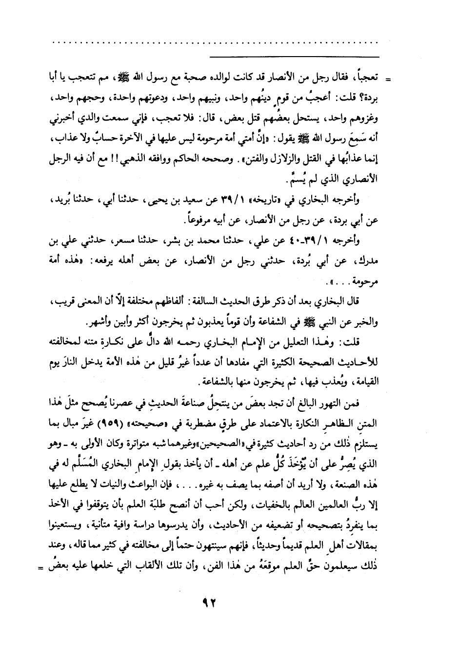 = تعجباً، فقال رجل من الأنصار قد كانت لوالده صحبة مع رسول الله - صلى الله عليه وسلم -، مم تتعجب يا أبا بردة؟ قلت: أعجب من قومٍ دينهم واحد، ونبيهم واحد، ودعوتهم واحدة، وحجهم واحد، وغزوهم واحد، يستحل بعضهم قتل بعض، قال: فلا تعجب، فإني سمعت والدي أخبرني أنه سمع رسول الله - صلى الله عليه وسلم - يقول: " إن أمتي أمة مرحومة ليس عليها في الآخرة حسابٌ ولا عذاب، إنما عذابها في القتل والزلازل والفتن ". وصححه الحاكم ووافقه الذهبي!! مع أن فيه الرجل الأنصاري الذي لم يُسمَّ.