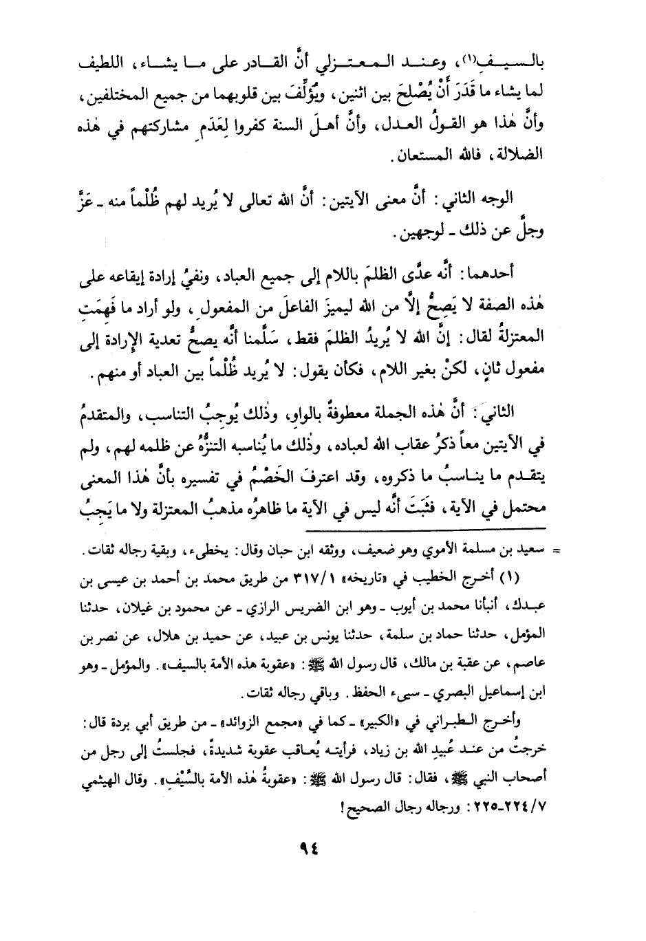 أحدهما: أنه عدى الظلم باللام إلى جميع العباد، ونفي إرادة إيقاعه على هذه الصفة لا يصح إلاَّ من الله ليميز الفاعل من المفعول، ولو أراد ما فهمت المعتزلة لقال: إن الله لا يريد الظلم فقط، سلمنا أنه يصح تعدية الإرادة إلى مفعول ثانٍ، لكن بغير اللام، فكان يقول: لا يريد ظلماً بين العباد أو منهم.