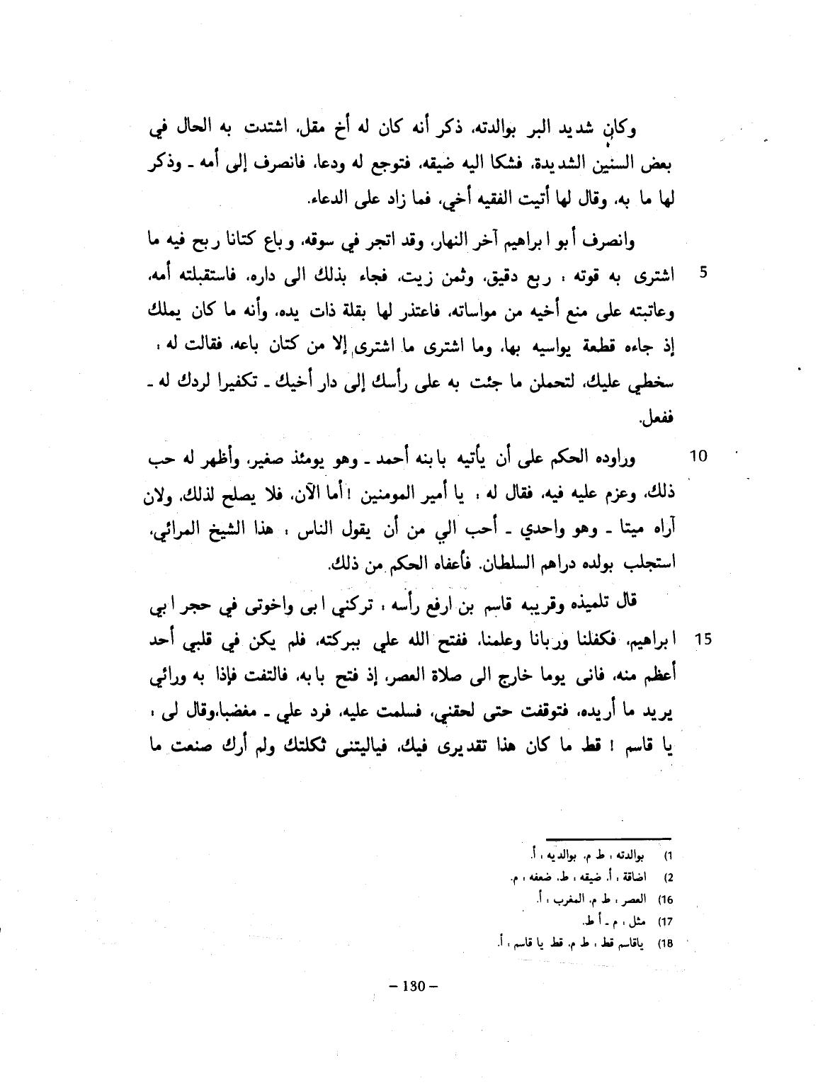 وكان شديد البرّ بوالدته. ذُكر أنه كان له أخ، قد اشتدت به الحال في بعض السنين الشديدة. فشكا إليه ضعفه. فتوجع له ودعا وانصرف الى أمه. وذكر لها ما به. وقال لها: أتيت الفقيه أخي، فما زاد على الدعاء. وانصرف أبو ابراهيم آخر النهار وقد اتّجر في سوقه، وباع كتّاناً ربح فيها ما اشترى به قوته: ربع دقيق، وثُمن زيت. فجاء بذلك الى داره، فاستقبلته أمه وعاتبته على منع أخيه من مؤاساته. فاعتذر لها بقلة ذات يده، وأنه ما كان يملك إذ جاءه، قطعة يواسيه بها. وما اشترى ما اشترى إلا من كتان باعه. فقالت له: سخطي عليك، لتحملن ما جئت به على رأسك، الى دار أخيك. تكفّر ردك له، ففعل. وراوده الحكم على أن يأتيه بابنه أحمد، وهو يومئذ صغير، وأظهر له حب ذلك. وعزم عليه فيه. فقال: يا أمير المؤمنين أما الآن فلا يصلح لذلك. والآن: أراه ميتاً - وهو واحِدي - أحبّ إلي من أن يقول الناس هذا الشيخ المرائي، استجلب بولده دراهم السلطان. فأعفاه الحكم من ذلك. قال تلميذه، وقريبه قاسم بن أرفع رأسه: تركني أبي، وإخوتي في حجر أبي ابراهيم. فكفلنا وربّانا وعلّمنا. ففتح الله عليّ ببركته. فلم يكن في قلي أحد أعظم منه لي. كنت يوماً خارجاً الى صلاة العصر، إذ فتح بابه، فإذا به ورائي، يريد مثل ما أريده. فتوقفت حتى لحقني. فسلمت عليه. فردّ عليّ مغضباً، وقال لي: يا قاسم، قط ما كان هذا تقديري فيك. فيا ليتني ثكلتك، ولم أرك صنعت ما