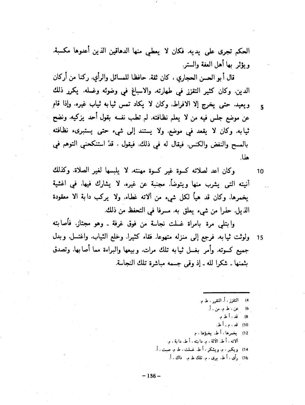 الحكَم تجري على يديه. فكان لا يعطي منها الدهاقين الذين أعدوها مكسبة، ويؤثر بها أهل الفقه والسنن. قال أبو الحسن الحجازي: كان ثقة حافظاً للمسائل والرأي، ركناً من أركان الدين. وكان كثير التغرر في طهارته، والأسباغ في وضوئه وغسله، يكرر ذلك ويعيد، حتى يخرج الى الإفراط. وكان لا يكاد يمس بثيابه ثياب غيره. وإذا قام عن موضع جلس فيه من لا يعلم نظافته، لم يمسه، ويقول: أحد يزكيه. ونضح ثيابه. وكان لا يقعد في موضع، ولا يستند الى شيء، حتى يستبرئ نظافته بالمسح والنفض والكنس. فيقال له في ذلك، فيقول: أستحي التوهم في هذا. وكان قد أعد لصلاته كسوة غير كسوته لمهنته، لا يلبسها لغير الصلاة. وكذلك آنيته التي يشرب منها، ويتوضأ، مجنبة عن غيرها، لا يشارك فيها، في أغشية يخبؤها. وكان قد هيأ لكل شيء من الآلة غطاء، ولا يركب دابة إلا معقودة الذيل، حذراً من شيء يعلق به، مسرفاً في التحفظ من ذلك. وابتلي مرة بامرأة غسلت نجاسة من فوق غرفة وهو مجتاز، فأصابته ولوثت ثيابه، فرجع الى منزله مقذوعاً قفاه كثيراً. وخلع الثياب واغتسل، وبدل كسوته، وأمر بغسل كسوته تلك وبيعها والبراءة مما أصابها، وتصدّق بثمنها شكراً لله، إذ وقى جسمه مباشرة تلك النجاسة.