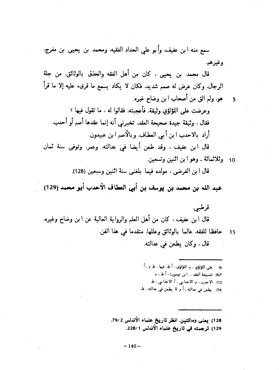 أبو محمد، قرطبي. قال ابن عفيف: كان من أهل العلم والرواية العالية، عن ابن وضّاح وغيره. حافظاً للفقه. عالماً بالوثائق وعللها. متقدّماً في هذا الفن. قال: وكان يطعن في عدالته.