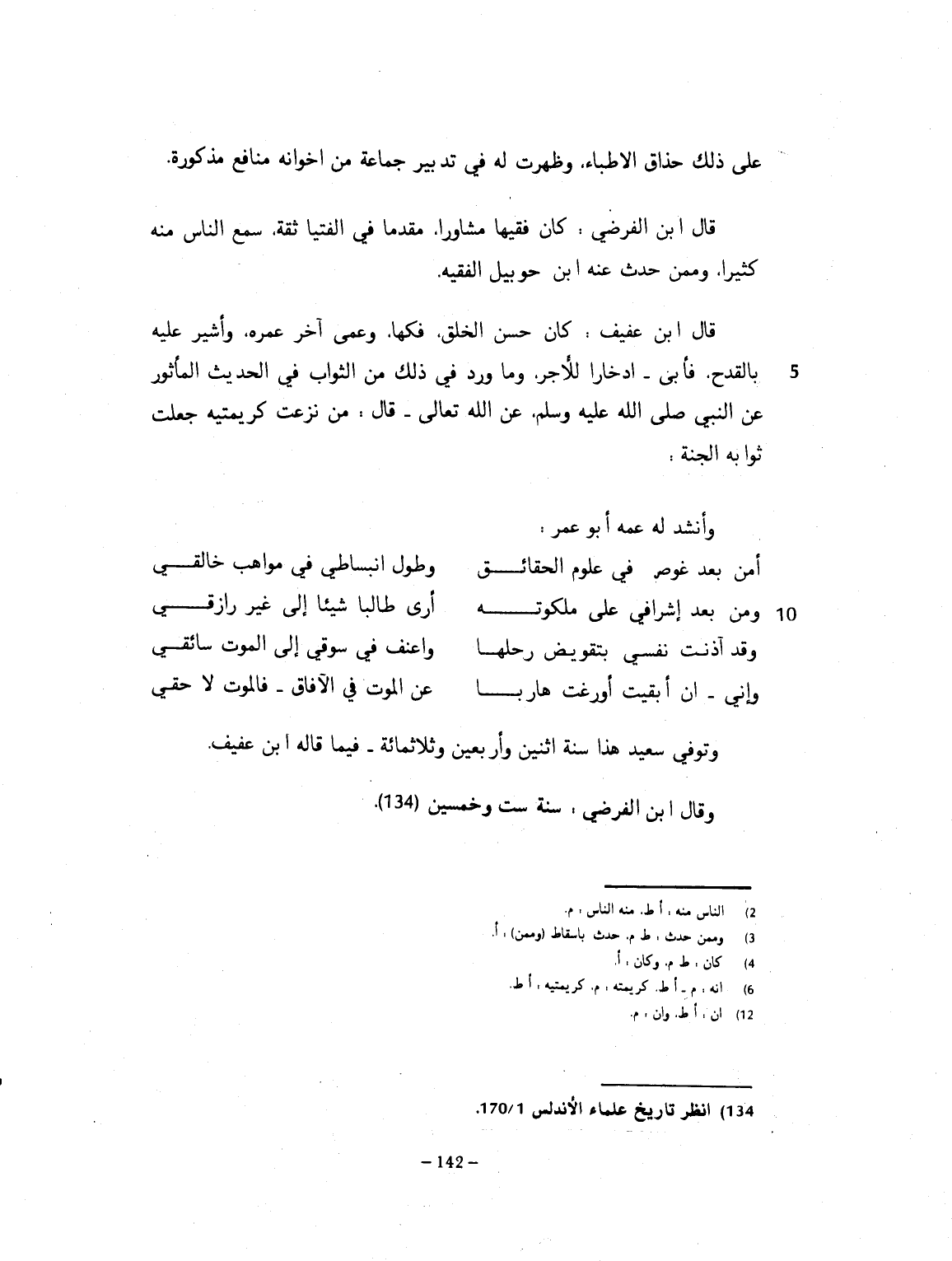 على ذلك حذاق الأطباء. وظهرت له في تدبير جماعة من إخوانه منافع مذكورة. قال ابن الفرضي: كان فقيهاً مشاوراً، مقدّماً في الفتيا، ثقة. سمع منه الناس كثيراً. وقد حدّث عنه أبو حرملة الفقيه. قال ابن عفيف: كان حسن الخلق، فكِهاً. وعمي آخر عمره، وأشير عليه بالقدح فأبى ادخاراً للآخرة. وما روى في ذلك من الثواب في الحديث المأثور عن النبي صلى الله عليه وسلم عن الله تعالى، أنه قال: من نزعت كريمته، جعلت ثوابه الجنة. وأنشد له عمه أبو عمر رحمه الله: