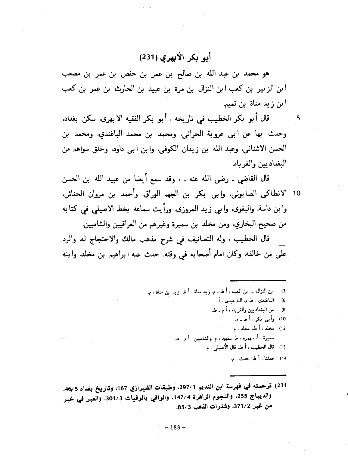 رحمه الله. هو محمد بن عبد الله بن صالح بن عمر بن حفص بن عمر بن مصعب بن الزبير بن كعب بن زيد بن مناة بن تميم. قال أبو بكر الخطيب في تاريخه: أبو بكر الفقيه الأبهري سكن بغداد، وحدث بها عن أبي عروبة الحراني، ومحمد بن الباغندي، ومحمد بن الحسين الأشناني، وعبد الله بن زيدان الكوفي، وابن أبي داود، وخلق سواهم من البغداديين والغرباء. قال القاضي رضي الله عنه: وقد سمع أيضاً من عبيد الله بن الحسن الأنطاكي الصابوني، وأبي بكر بن الجهم الوراق، وأحمد بن مروان الخيّاش، وابن داسة، واللغوي، وابن زيد المروزي. ورأيت سماعه بخط الأصيلي في كتابه، من صحيح البخاري، ومن مجلد ابن سفهود، وغيرهم من العراقيين والشاميي. قال الأصيلي: وله التصانيف في شرح مذهب مالك، رضي الله عنه، والاحتجاج له، والرد على من خالفه. وكان إمام أصحابه في وقته. حدث عنه ابراهيم بن مخلد، وابنه