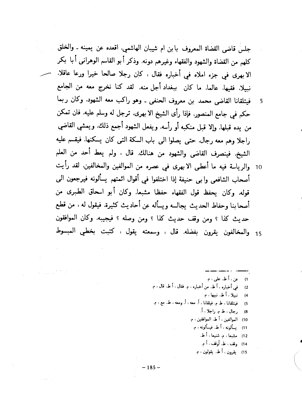 جلس قاضي القضاة المعروف بابن أم شيبان، الهاشمي، أقعده عن يمينه، والخلق كلهم، من القضاة والشهود، والفقهاء وغيرهم، دونه. وذكر أبو القاسم الوهراني أبا بكر الأبهري، في جزء أملاه من أخباره. قال: كان رجلاً صالحاً خيراً، ورعاً، عاقلاً، نبيهاً فقيهاً عالماً. ما كان ببغداد أجلّ منه. لقد كنا نخرج معه من الجامع فيتلقانا محمد القاضي: ابن معروف الحنفي، وهو راكب مع الشهود، وكان ربما حكم في جامع المنصور. فإذا رأى الشيخ الأبهري، ترجل له وسلم عليه. فإن تمكن من يده قبّلها، وإلا قبّل منكبه ورأسه، ويفعل الشهود أجمع، ذلك. ويمشي القاضي راجلاً، وهم معه رجالاً. حتى يصلوا الى باب السكة التي كان يسكنها. فيقسم عليه الشيخ فينصرف القاضي والشهود من هنالك. قال: ولم يعطَ أحد من العلم والرئاسة فيه، ما أعطي الأبهري في عصره، من الموافقين والمخالفين. لقد رأيت أصحاب الشافعي، وأبي حنيفة، إذا اختلفوا في أقوال أئمتهم، يسألونه، فيرجعون الى قوله. وكان يحفظ أقوال الفقهاء حفظاً مشبعاً. وكان أبو إسحاق الطبري - من أصحابنا وحفاظ الحديث - يجالسه، ويسأله عن أحاديث كثيرة. فيقول له من قطع حديث كذا؟ ومن وقف حديث كذا؟ ومن وصله؟ فيجيبه. وكان الموافقون والمخالفون يقولون بفضله. قال: وسمعته يقول: كتبت بخطي المبسوط