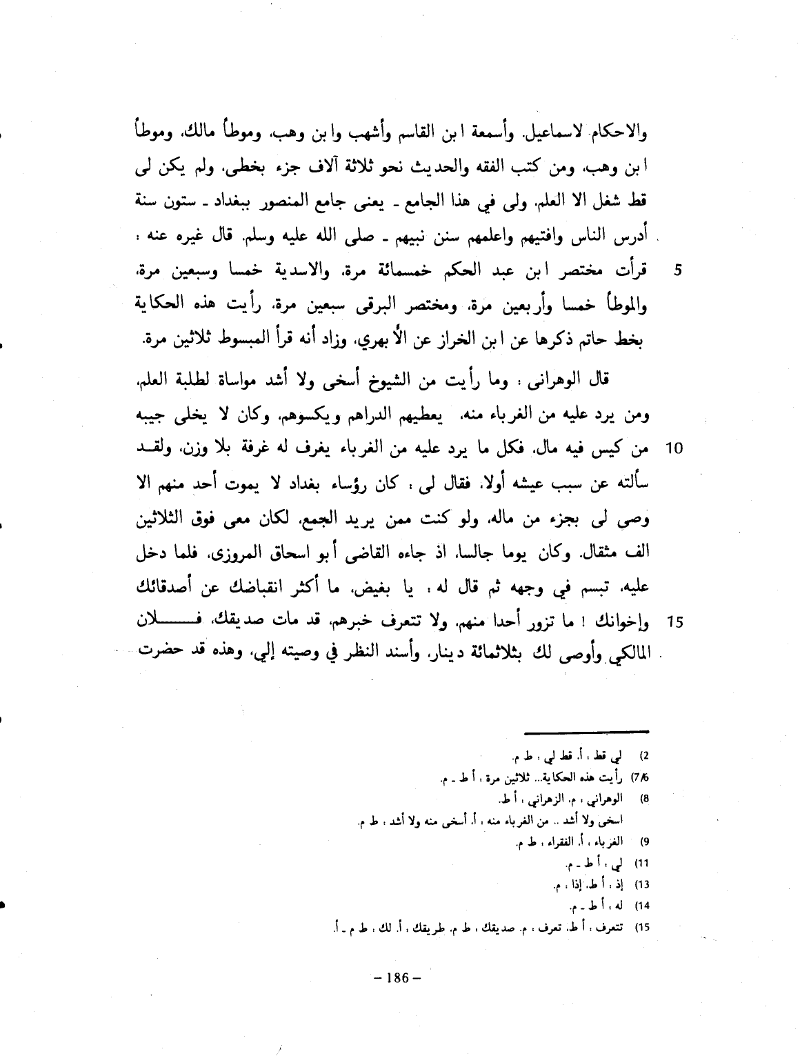 والأحكام لاسماعيل. وأسمعت ابن القاسم وأشهب، وابن وهب وموطأ مالك، وموطأ ابن وهب. ومن كتب الفقه والحديث نحو ثلاثة آلاف جزء بخطي. ولم يكن قط لي شغل إلا العلم. ولي في هذا الجامع - يعني جامع المنصور ببغداد - ستون سنة أدرّس الناس وأفتيهم، وأعلمهم سنن نبيّهم صلى الله عليه وسلم. قال غيره عنه: قرأت مختصر ابن عبد الحكم خمسمائة مرة. والأسدية خمساً وسبعين مرة. والموطأ خمساً وأربعين مرة. ومختصر البرني سبعين مرة. قال الوهراني: وما رأيت من الشيوخ أسخى منه. ولا أشد مؤاساة لطلبة العلم. ومن يرد عليه من الغرباء يعطيهم الدراهم، ويكسوهم. وكان لا يخلي جيبه من كيس، فيه مال. فكل من يرد عليه من الفقراء يغرف له غرفة بلا وزن. ولقد سألته عن سبب عيشه، أولاً. فقال: كان رؤساء بغداد، لا يموت أحد منهم إلا وصّى لي من ماله. ولو