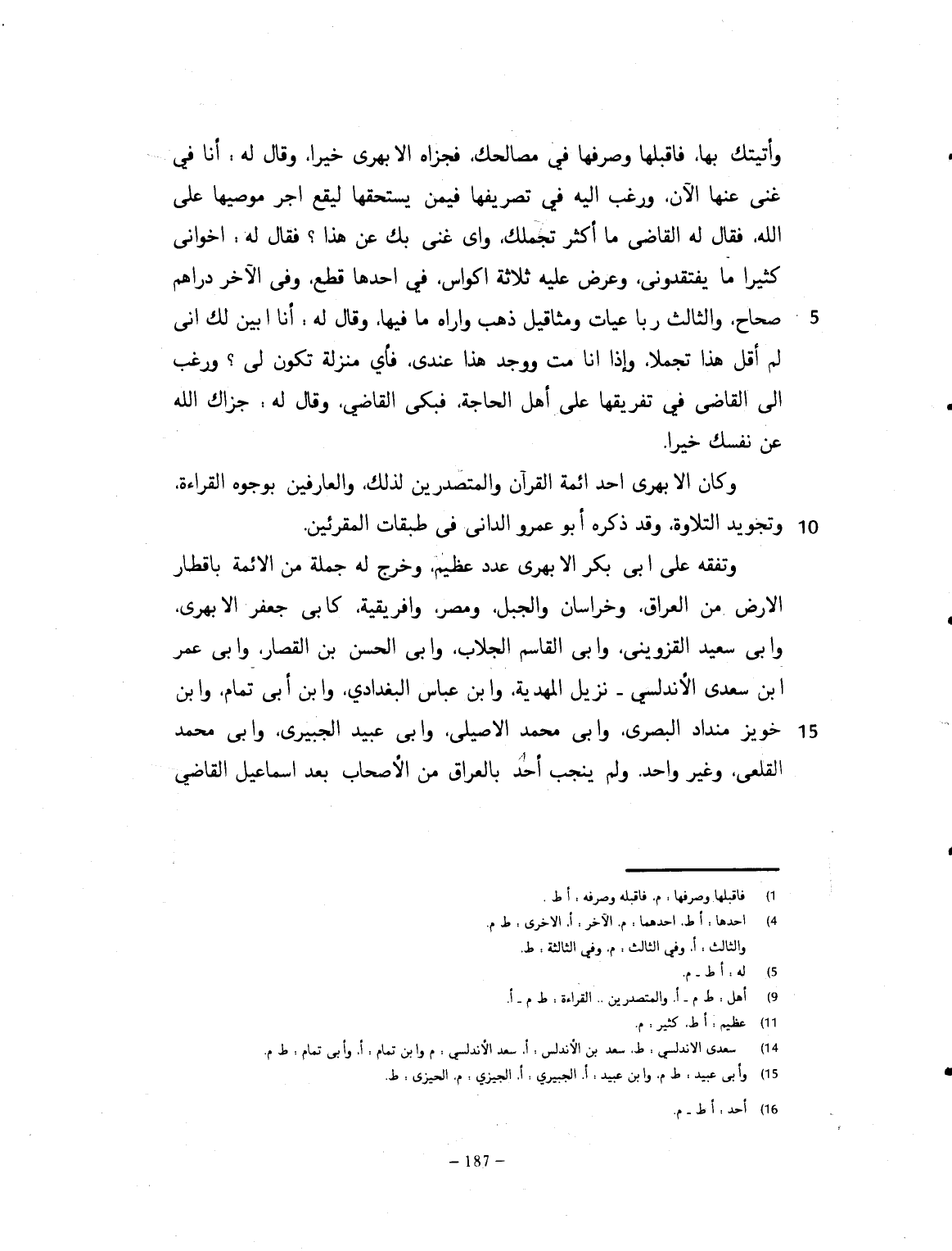 وأتيتك فأقبلها وأصرفها في مصالحك، فجزاه الأبهري خيراً. وقال له: أنا في غنى عنها الآن، ورغب إليه في تصريفها ممن يستحفظها ليقع أجر موصيها على الله. فقال له القاضي: ما أكثرك محلل، وإني بك عن هذا. فقال له: إخواني كثيراً ما يعتقدوني، وعرض عليه ثلاثة أكياس في أحدهما قطع، وفي الآخر دراهم صحاح، وفي الثالث رباعيات، ومثاقل ذهب، وأراه ما فيها، وقال: أنا أبيّن لك أني لم أقل هذا مجملاً. وإذا أنا مت ووجد هذا عندي، فأي منزلة تكون لي؟ ورغب الى القاضي في تفريقها على أهل الحاجة. فبكى القاضي، وقال: جزاك الله عن نفسك خيراً. وكان الأبهري أحد أئمة أهل القرآن، والمتصدرين لذلك، العارفين بوجوه القرآن، وتحرير التلاوة. وقد ذكره أبو عمر الداني في طبقات المقرئين، وتفقه على أبي بكر الأبهري عدد كثير، وخرج له جملة الأئمة بأقطار الأرض من العراق وخراسان، والحجاز ومصر، وإفريقية. كأبي جعفر الأبهري، وأبي سعيد القزويني، وأبي القاسم الجلاب، وأبي الحسن بن القصار، وأبي عمر بن سعد الأندلسي، نزيل المهدية. وابن عباس البغدادي. وأبي تمام، وابن خويرمنداد البصري، وأبي محمد الأصيلي، وأبي عبيد الحيوني، وأبي محمد القلعي، وغير واحد. ولم ينجب أحد من الأصحاب بعد اسماعيل القاضي،
