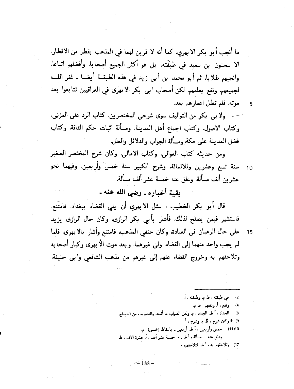 ما أنجب أبو بكر الأبهري، كما أنه لا قرين لهما في المذهب بقطر من الأقطار، إلا سحنون بن سعيد في طبقته. بل هو أكثر الجمع أصحاباً، وأفضلهم أتباعاً. وأنجحهم طلاباً. ثم أبو محمد بن أبي زيد رضي الله عنه في هذه الطبقة أيضاً. غفر الله لجميعهم. ونفعهم بعلمهم. لكن أصحاب أبي بكر، العراقيين، تتابعوا بعد موته، فلم تطل أعمارهم بعد، ولأبي بكر من التواليف، سوى شرحي المختصرين. كتاب الرد على المزني. وكتاب الأصول. وكتاب إجماع أهل المدينة. ومسألة إثبات حكم الغابة. وكتاب فضل المدينة على مكة. ومسأل الجواد والدلائل، والملل. ومن حديثه كتاب العوالي، وكتاب الأمالي. وكان شرح المختصر الصغير، سنة تسع وعشرين وثلاثماية. وشرح الكبير، سنة أربعين. وفيهما نحو عشرين ألف مسألة.