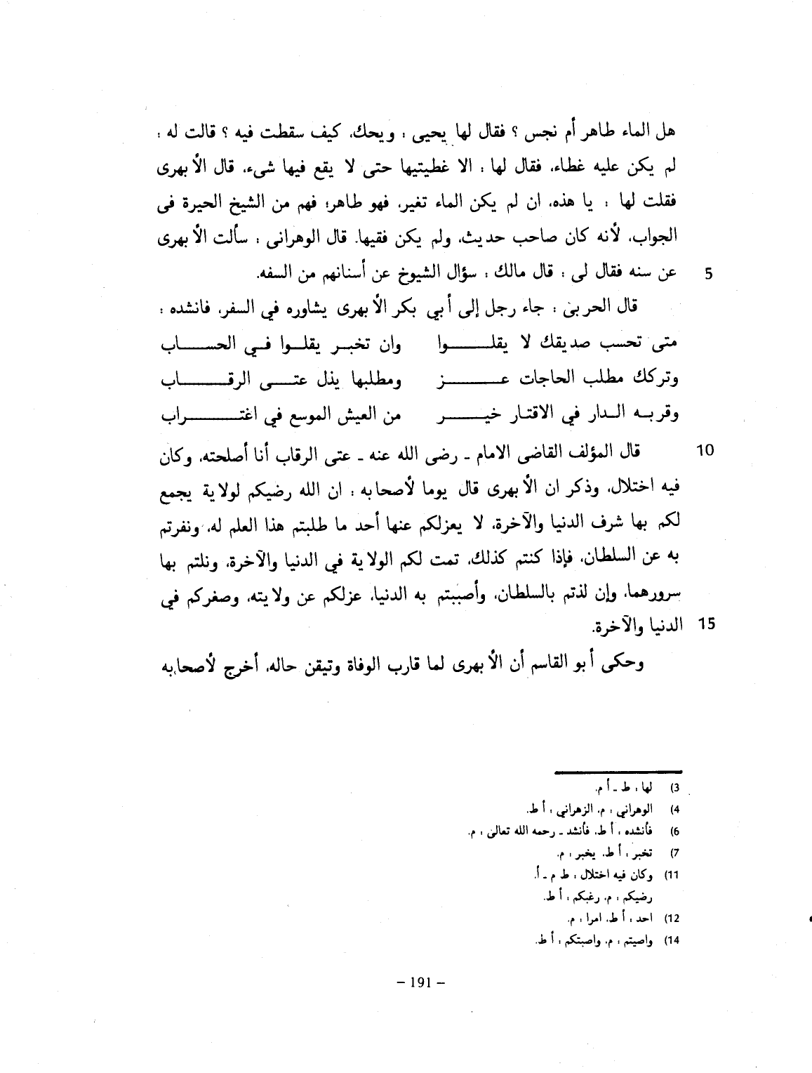 هل الماء طاهر أو نجس؟ فقال لها يحيى: ويحك كيف سقطت فيه؟ قالت: لم يكن عليه غطاء. فقال: ألا غطيتها حتى لا يقع فيها شيء. قال الأبهري: فقلت لها: يا هذه إن لم يكن الماء تغير فهو طاهر. فهِم من الشيخ الحيرة في الجواب، لأنه كان صاحب حديث، ولم يكن فقيهاً. قال الوهراني: سألت الأبهري عن سنه، فقال لي: قال مالك رضي الله عنه: سؤال الشيوخ عن أسنانهم من السفه. قال الحربي: جاء رجل الى أبي بكر الأبهري، يشاوره في السفر، فأنشد رحمه الله:
