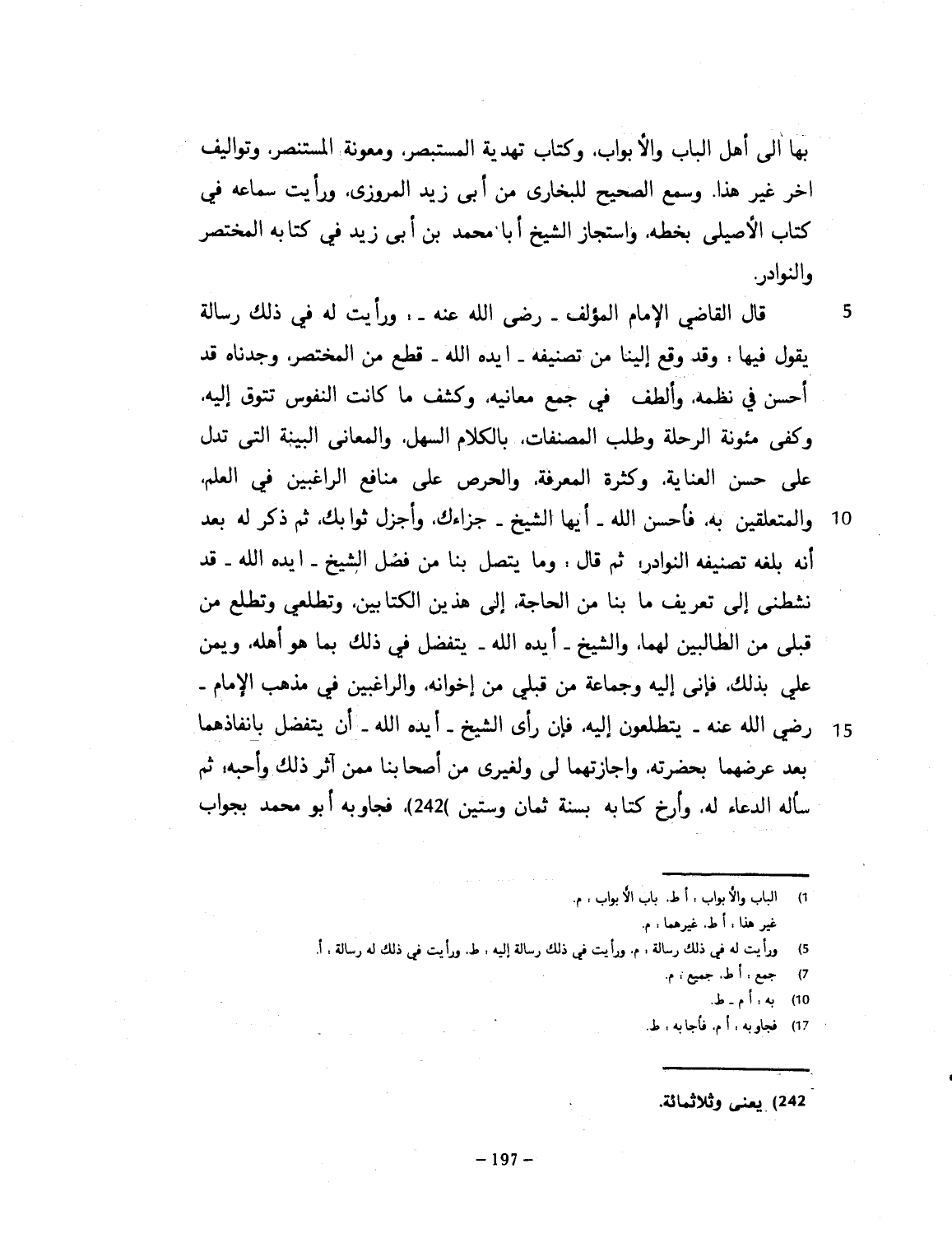بها الى أهل باب الأبواب. وكتاب تهدية المتبصر ومعونة المستنصر. وتواليف أخرى وغيرهما. وسمع الصحيح للبخاري، من أبي زيد المروزي، ورأيت سماعه في كتاب الأصيلي بخطه، واستجاز الشيخ أبا محمد بن أبي زيد رحمه الله، في كتاب المختصر والنوادر. قال القاضي الإمام المؤلف رضي الله عنه: ورأيت له في ذلك رسالة يقول فيها: وقد وقع إلينا من تصنيفه - أيده الله - قطع من المختصر، وجدناه قد أحسن في نظمه، وألطف في جمع معانيه، وكشف ما كانت النفوس تتوق إليه، وكفى مؤونة الرحلة، وطلب المصنفات، بالكلام السهل، والمعاني البينة، التي تدل على حسن العناية، وكثرة المعرفة، والحرص على منافع الراغبين في العلم، والمتعلقين به. فأحسن الله أيها الشيخ جزاءك. وأجزل ثوابك. ثم ذكر له بعد أن بلغه، تصنيف النوادر. ثم قال: وما يتصل بنا من فضل الشيخ، أيده الله. قد نشطني الى تعريف ما بنا من الحاجة الى هذين الكتابين. وتطلعي وتطلع من قبلي من الطالبين لها. والشيخ، أيده الله، يتفضل في ذلك بما هو أهله، ويمنّ عليّ بذلك، فإني إليه، وجماعة من قبلي من إخوانه، والراغبين في مذهب الإمام رضوان الله عليه، يتطلعون إليه. فإن رأى الشيخ أيده الله، أن يتفضل بإنفاذها، بعد عرضها بحضرته، وإجازتها لي، ولغيري من أصحابنا، ممن آثر ذلك وأحبه. ثم سأله الدعاء له، وأرخ كتابه بسنة ثمان وستين. فجاوبه أبو محمد بجواب