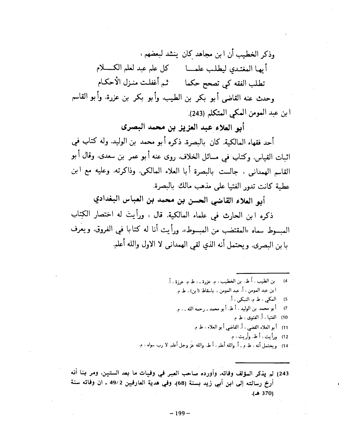 ذكره ابن حارث في علماء المالكية. قال: ورأيت له اختصار الكتاب المبسوط، سماه المقتضب من المبسوط. ورأيت أن له كتاباً في الفروق، ويعرف بابن البصري، ويحتمل أنه الذي لقي الهمداني، لا الأول. والله عز وجلّ أعلم. لا ربّ سواه.