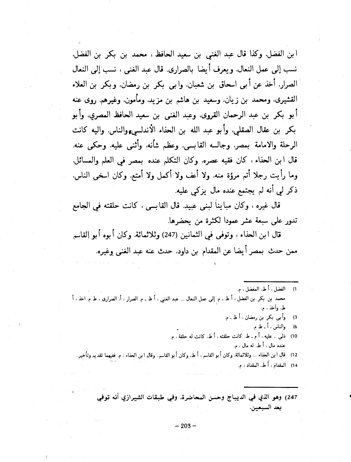 بن المفضل. وكذا قال عبد الغني. نسب الى النّعال الصواري. أخذ عن أبي اسحاق ابن شعبان. وبكر بن العلاء القشيري. ومحمد بن زيان. وسعيد بن هاشم، وابن يزيد، ومأمون، وغيرهم. روى عنه ابو بكر بن عبد الرحمن القروي. وعبد الغني بن سعيد الحافظ المصري. وابو بكر بن عقال الصقلي. وأبو عبد الله بن الحذّاء الأندلسي. وإليه كانت الرحلة والإمامة بمصر. وجالسه القابسي، وعظّم شأنه، وأثنى عليه. وحكى عنه. قال ابن الحذّاء: كان فقيه عصره، وكان المتكلم عنده بمصر في العلم والمسائل. وما رأيت رجلاً أتم مروءة منه، ولا أعف ولا أكمل، ولا أقنع. وكان أسخى الناس. ذكر لي أنه لم يجتمع له ما يزكّى عليه. قال غيره: وكان مبايناً لبني عبيد الله. قال القابسي: كانت حلقته في الجامع، تدور على سبعة عشر عموداً، لكثرة من يحضرها. وكان أبو القاسم، ممن حدث بمصر أيضاً عن المقداد بن داود. حدث عنه عبد الغني وغيره. وقال ابن الحذاء: وتوفي رحمه الله، في الثمانين والثلاثماية.