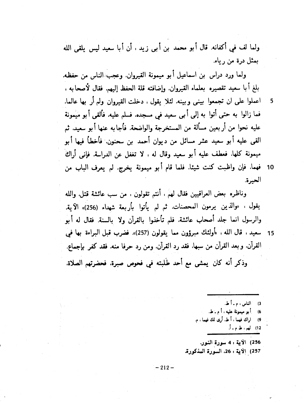 ولما لفّ في أكفانه، قال أبو محمد بن أبي زيد: رحمه الله، إن أبا سعيد ليس يلقى الله بمثل ذرة من رياء. ولما ورد درّاس بن اسماعيل، أبو ميمونة، القيروان، وعجب الناس من حفظه، بلغ أبا سعيد تقصيره بعلماء القيروان، وأضافته قلة الحفظ إليهم. فقال لأصحابه: اعملوا على أن تجمعوا بيني وبينه لئلا يقول دخلت القيروان ولم أرَ بها عالماً. فما زالوا به، حتى أتوا به الى أبي سعيد في مسجده. فسلم عليه. فألقى أبو ميمونة عليه نحواً من أربعين مسألة، من المستخرجة، والواضحة. فأجابه عنها أبو سعيد. ثم ألقى عليه أبو سعيد عشر مسائل من ديوان محمد بن سحنون، فأخطأ فيها، أبو ميمونة كلها، فعطف عليه أبو سعيد وقال له: لا تغفل عن الدراسة، فإني أرى لك فَهماً. فإن واظبت، كنت شيئاً. فلما قام أبو ميمونة يخرج، لم يعرف الباب من الحيرة. وناظره بعض العراقيين، فقال لهم: أنتم تقولون من سبّ عائشة قتل. والله يقول: " والذين يرمون المحصَنات ثم لم يأتوا بأربعة شُهداء " الآية. والرسول إنما جلد أصحاب عائشة. فلم تأخذوا بالقرآن ولا بالسنّة. فقال له أبو سعيد: قال الله تعالى: " أولئك مُبرأون مما يقولون ". ليضرب مثل البراءة بما في القرآن. وبعد القرآن، من سبّها فقد رد القرآن، ومن رد حرفاً منه، فقد كفر بإجماع. وذكر أنه كان يمشي مع أحد طلبته في فحوص صبرة، فحضرتهم الصلاة.