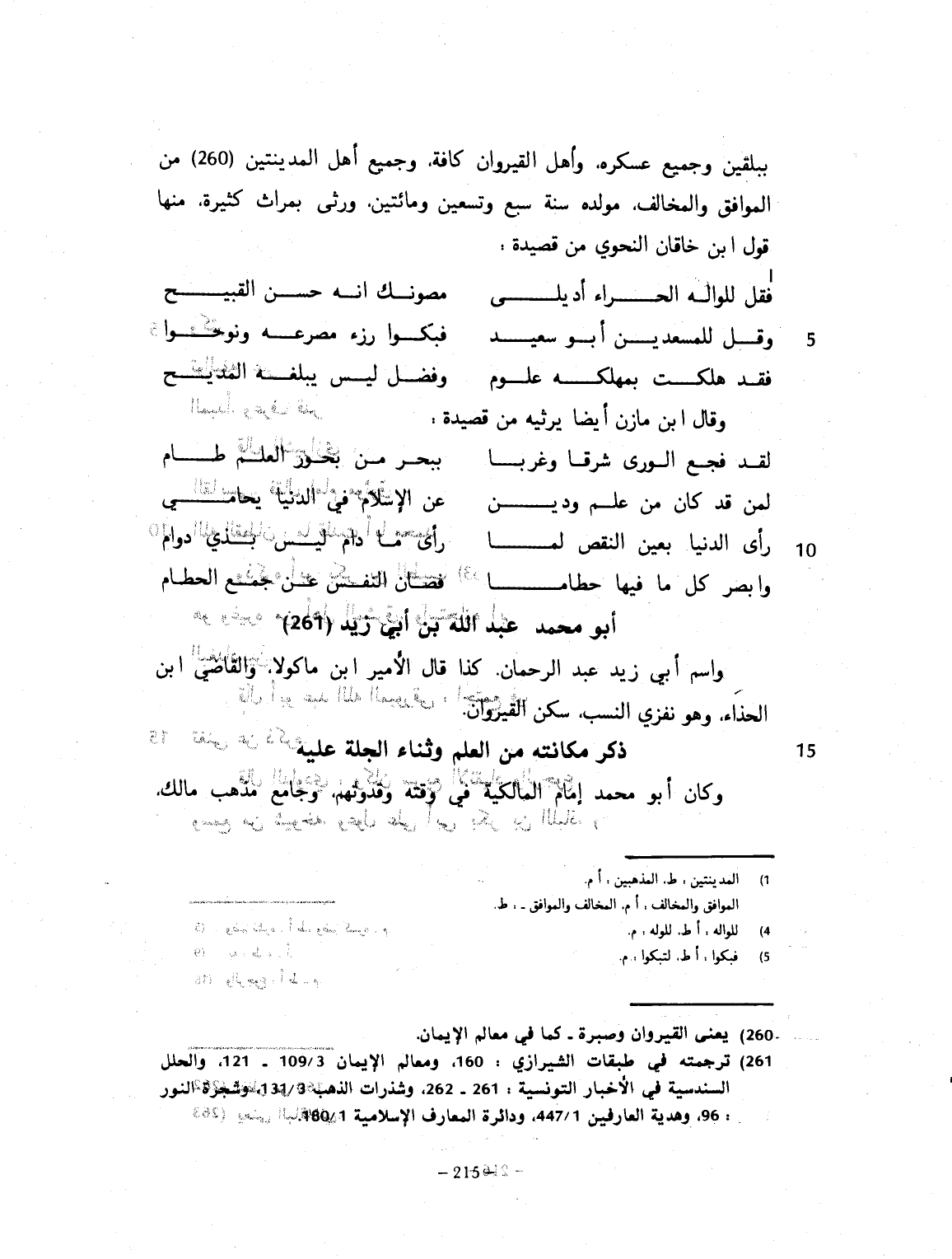 ببلقين. وجميع عسكره، وأهل القيروان كافة، وجميع أهل المذهبين، من الموافق والمخالف. مولده: سنة سبع وتسعين ومايتين، ورثي بمرات كثيرة منها، قول ابن خاقان النحوي، من قصيدة: