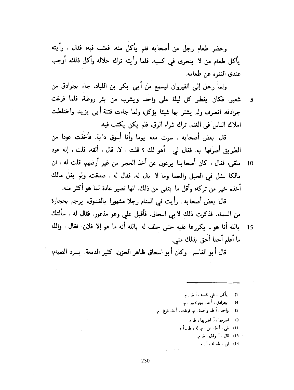 وحضر طعام رجل من أصحابه، فلم يأكل منه، فعتب فيه. فقال: رأيته ترك حلاله، وأكل ذلك أوجب عندي التنزه عن طعامه. ولما رحل الى القيروان، ليسمع من أبي بكر ابن اللباد، جاء بجراديق من شعير، فكان يفطر كل ليلة على واحدة. ويشرب من بئر بروطة. فلما فرغ جرادقه، انصرف، ولم يشتر بها شيئاً يأكل، ولما جاءت فتنة أبي يزيد، واختلطت أملاك الناس في الغنم، ترك شراءَ الرّق، فلم يكتب فيه. قال بعض أصحابه: سرت معه يوماً، وأنا أسوق دابة. فأخذت عوداً من الطريق أضربها به. فقال لي، أهو لك؟ قلت: لا. قال: القه. قلت: إنه عود ملقى. فقال: كان أصحابنا يزعون عن أخذ الحجر من أرضهم، قلت له: إن مالكاً سئل عن الحبل والعصا؟ وما لا بال له؟ فقال: صدقت ولم يقل مالك: أخذه خير من تركه. وأقل ما يُتّقى من ذلك، أنها تصير عادة، هو أكثر من ذلك. وقال بعض أصحابه: رأيت في المنام رجلاً مشهوراً بالفسوق، يرجم بحجارة من السماء. فذكرت ذلك لأبي إسحاق. فأقبل عليّ، وهو مذعور. فقال: سألتك بالله أنا هو؟ يكررها عليّ، حتى حلفت له بالله، أنه إنما هو إلا فلان. فقال: والله ما أعلم أحداً أحقّ بذلك مني. قال أبو القاسم: وكان أبو إسحاق ظاهر الحزن، كثير الدمعة، يسرد الصيام.