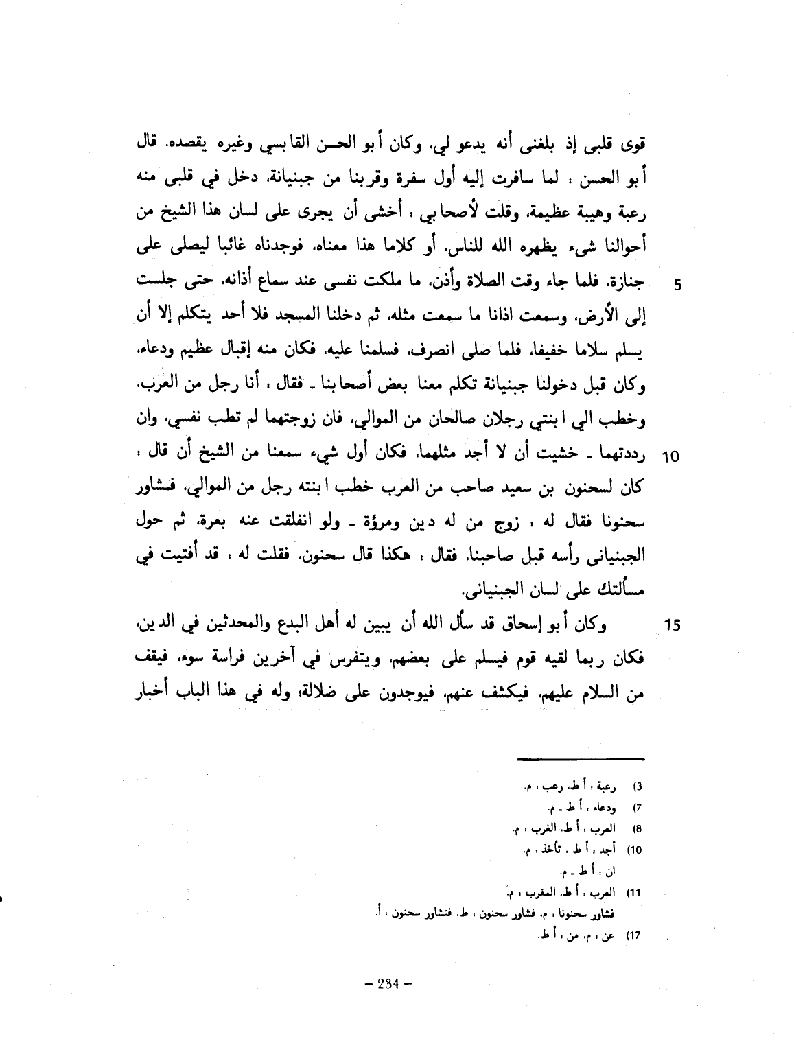قوي قلبي إذ بلغني أنه يدعو لي. وكان أبو الحسن القابسي وغيره بقصده. قال أبو الحسن: لما سافرت إليه، أول سفرة، وقربنا من جبنيانة. دخل في قلبي منه رعب وهيبة عظيمة، وقلت لأصحابي: أخشى أن يجري على لسان هذا الشيخ، من أحوالنا شيء يظهره الله للناس، أو كلاماً هذا معناه. فوجدناه غائباً ليصلي على جنازة. فلما جاء وقت الصلاة وأذّن، ما ملكت نفسي عند سماع أذانه، حتى جلست الى الأرض، وسمعت أذاناً ما سمعت مثله، ثم دخنا المسجد، فلا أحد يتكلم إلا أن يسلّم سلاماً خفياً. فلما صلى انصرف. فسلمنا عليه، فكان منه إقبال عظيم. وكان قبل دخولنا جبنيانة، تكلم معنا بعض أصحابنا، فقال لنا رجل من العرب: وخطب إلي ابنتي رجلان صالحان من الموالي، فإن زوجتها لم تطب نفسي، وإن رددتهما خشيت أن لا تأخذ مثلهما. فكان أول شيء سمعنا من الشيخ قال: كان لسحنون بن سعيد صاحب من المغرب، خطب ابنته رجل من الموالي. فشاور سحنوناً، فقال له: زوّج من له دين ومروءة، ولو انفلقت عنه بعرة. ثم حوّل الجبنياني رأسه قِبَل صاحبنا فقال: هكذا قال سحنون. فقلت له قد أفتيت في مسألتك على لسان الجبنياني. وكان أبو إسحاق رحمه الله، قد سأل الله أن يبيّن له أهل البدع والمحدثين في الدين. فكان ربما لقيه قوم فيسلم على بعضهم، ويتفرس في آخرين فراسة سوء، فيقف عن السلام عليهم، فيكشف عنهم، فيوجدون على ضلالة، وله في هذا الباب