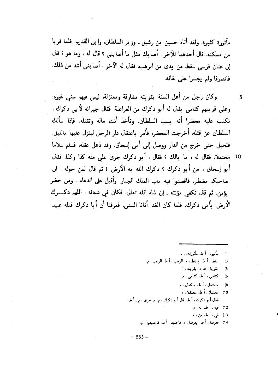 أخبار مأثورات كثيرة. ولقد أتاه حسن بن رشيق، وزير السلطان، وابن النديم، فلما قربا من مسكنه قال أحدهما للآخر: أصابك مثل ما أصابني؟ قال له: وما هو؟ قال: إن عنان فرسي يسقط من يدي من الرعب. فقال له الآخر أصابني أشد من ذلك. فانصرفا ولم يجسرا على لقائه. وكان رجل من أهل السنّة، بقرية مشارقة ومعتزلة، ليس فيهم سني غيره، وعلى قريتهم كتامي. يقال له أبو دكرك. من الفراعنة. فقال جيرانه، لأبي دكرك: تكتب عليه محضراً أنه سبّ السلطان، وتأخذ أنت ماله، وتقتله. فإذا سألك السلطان عن قتله، أخرجت المحضر، فأمر باعتقال دار الرجل، لينزل عليها بالليل، فتحيل حتى خرج من الدار، ووصل الى أبي إسحاق، وقد ذهل عقله، فسلم سلاماً محتفلاً فقال له: ما بالك؟ قال: أبو دكرك جرى عليّ منه ما جرى، كذا وكذا. فقال أبو إسحاق: من أبو دكرك؟ دكرك الله به الأرض. ثم قال لمن حوله: إن صاحبكم مضطرب فاقصدوا به باب الملك الجبار. وأقبل على الدعاء، ومن حضر يؤمّن. ثم قال: تُكفى مؤنته، إن شاء الله تعالى. فكان من دعائه: اللهم دكرك الأرض بأبي دكرك. فلما كان الغد، أتانا السنّي يعرفنا أن أبا دكرك، قتله عبيد