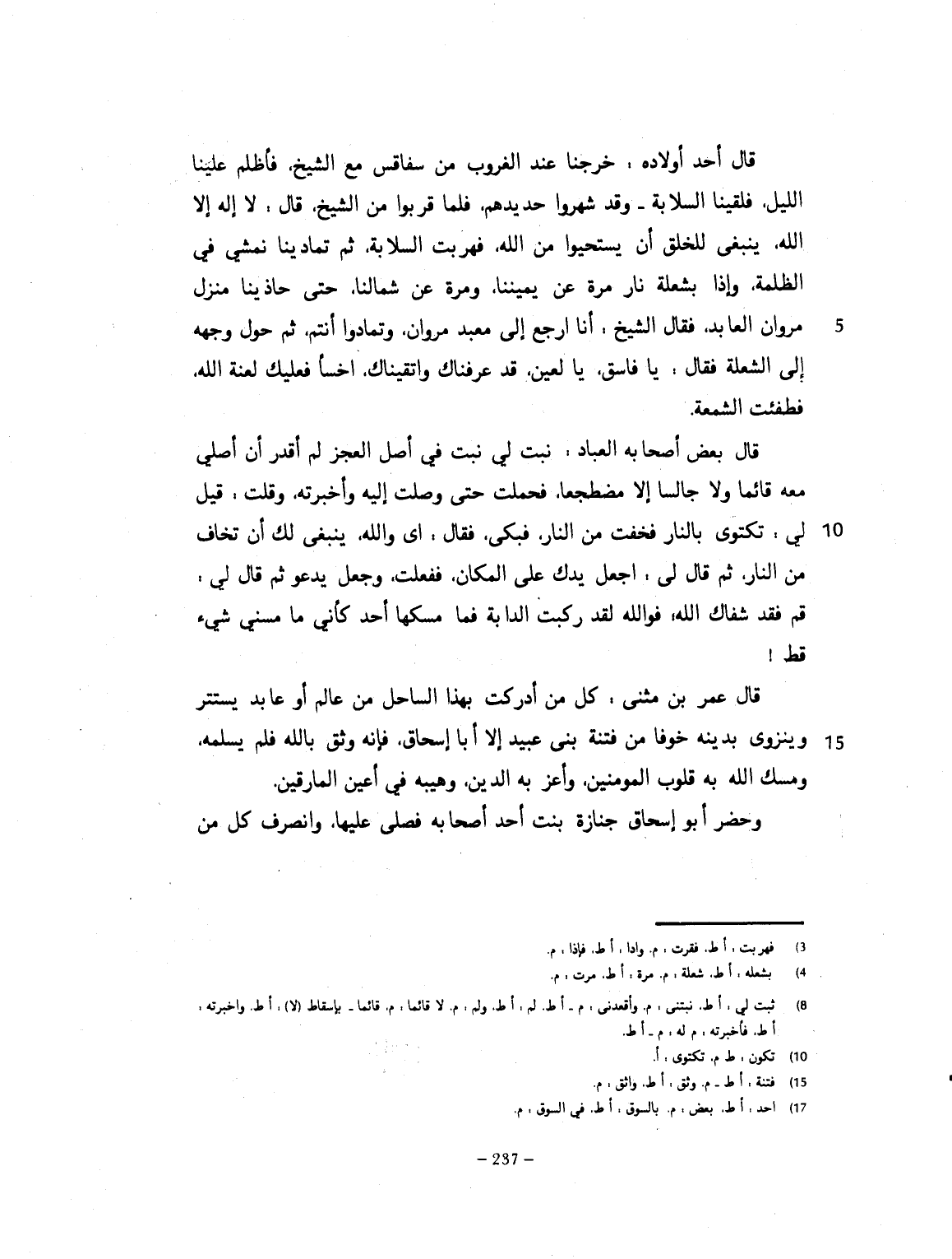 مرة عن يميننا، ومرة عن يسارنا. حتى حاذينا منزل مروان العابد. فقال الشيخ: أنا أرجع الى عند مروان. وتمادوا أنتم. ثم حوّل وجهه الى الشعلة. فقال: يا فاسق، يا لعين، قد عرفناك، واتقيناك، إخساً فعليك لعنة الله. وطفيت الشعلة. قال بعض أصحابه العباد: نبتني نبت في أصل العجز وأقعدني، ولم أقدر أن أصلي معه، لا قائماً ولا جالساً، إلا مضطجعاً. فحملت حتى وصلت إليه، فأخبرته وقلت: قيل لي تكتوي بالنار. فخفت من النار. فبكى وقال: أي والله ينبغي لك أن تخاف من النار. ثم قال لي: اجعل يدك على المكان، ففعلت وجعل يدعو، ثم قال لي: قم فقد شفاك الله. فوالله لقد ركبت الدابة، فما مسكها أحد كأني ما مسني شيء قط. قال عمر بن مثنى: كل من أدركت بهذا الساحل من عالم أو عابد، يستتر ويتروى بدينه، خوفاً من بني عبيد، إلا أبا إسحاق، فإنه واثق بالله، فلم يسلمه، ومسك الله به قلوب المؤمنين، وأعزّ به الدين، وهيّبه في أعين المارقين. وحضر أبو إسحاق جنازة بنت بعض أصحابه، فصلى عليها وانصرف كل من