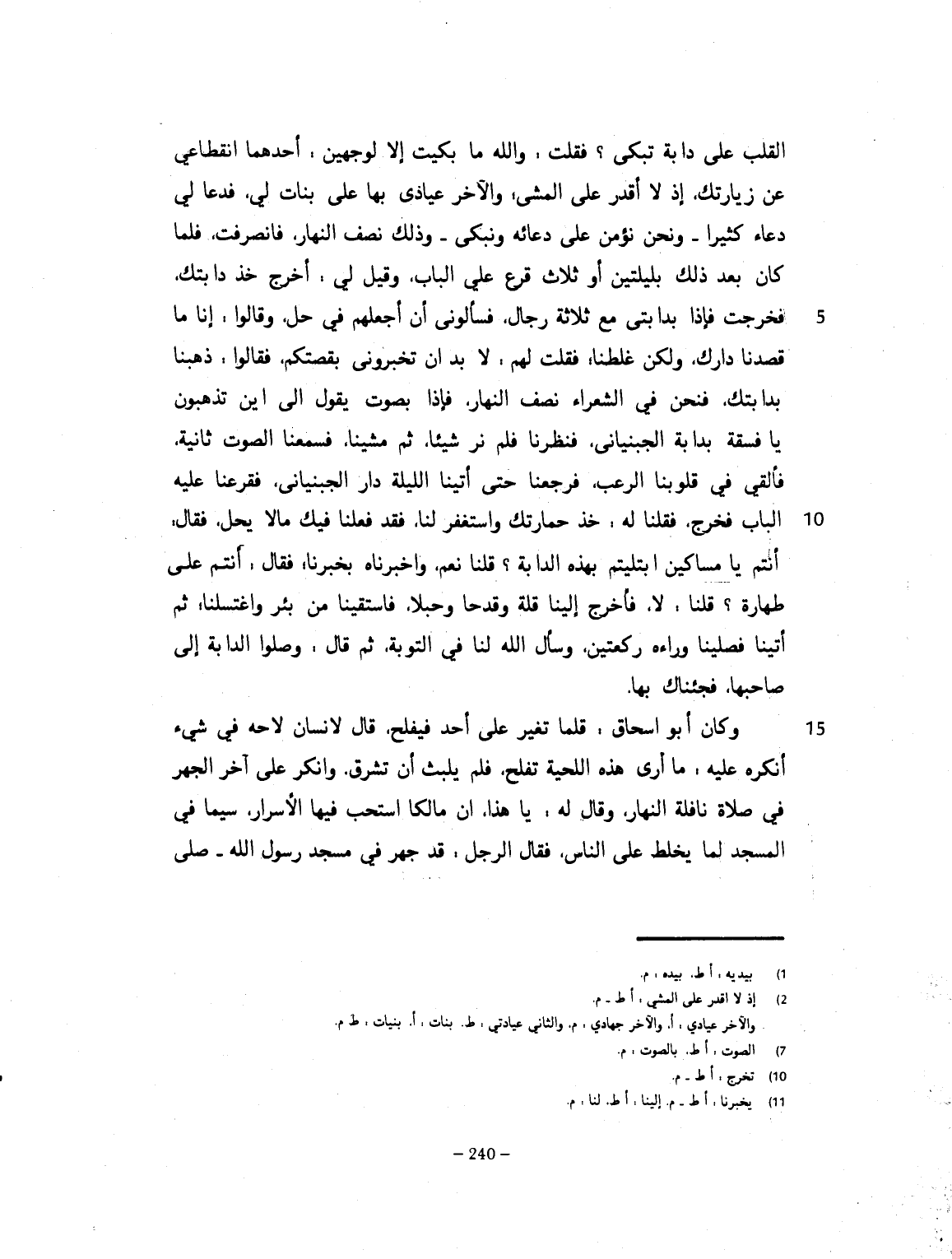 العقل، على دابة تبكي. فقلت: والله ما بكيت إلا لوجهين، أحدهما انقطاعي عن زيارتك، والآخر جهادي بها عن بنيات لي. فدعا لي دعاء كثيراً، ونحن نؤمّن على دعائه، ونبكي. وذلك نصف النهار، فانصرفت. فلما كان بعد ذلك بليلتين أو ثلاث، قرع على الباب. وقيل لي: أخرج خذ دابتك، فخرجت، فإذا بدابتي مع ثلاثة رجال. فسألوني أن أجعلهم في حلّ، وقالوا: ما قصدنا دارك ولكن غلطنا. فقلت لهم: