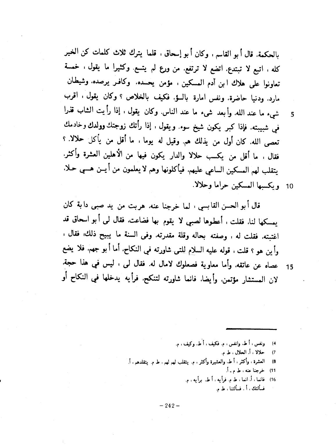 بالحكمة. قال أبو القاسم: وكان أبو إسحاق قلما يترك ثلاث كلمات، كن الخير كله: اتّبع لا تبتدع. اتضع لا ترتفع، من ورع لم يتسع. وكثيراً ما يقول: خمسة تعاونوا على هلاك ابن آدم المسكين: مؤمن يحسده، وكافر يرصده، وشيطان مارد، ودنيا حاضرة، ونفس أمارة بالسوء، وكان يقول: إذا رأيت الشاب قذراً، في شبيبته، فإذا كبر يكون شيخ سوء. ويقول: إذا رأتك زوجتك وولدك وخادمك تعصي الله، كان أول من يذلك: هم. وقيل له يوماً: ما أقل من يأكل الحلال. فقال: ما أقل من يكسب حلالاً. والدار يكون فيها من الأهلين العشرة وأكثر، ينقلب لهم المسكين الساعي عليهم، فيأكلونها وهم لا يعلمون من أين هي، حلالاً. ويكسبها المسكين حراماً وحلالاً. قال أبو الحسن القابسي: لما خرجنا عنه هربت من يد صبي دابة، كان يمسكها لنا. فقلت: أعطوها لصبي لا يقوم بها فضاعت فقال لي أبو إسحاق: قد اغتبته. فقلت له: وصفته بحاله وقلة مقدرته. وفي السنّة ما يبيح ذلك. فقال: وأين هو؟ قلت قوله عليه السلام التي شاورته في النكاح: أما أبو جهم فلا يضع عصاه على عاتقه. وأما معاوية فصعلوك لا مال له. قال، فقال لي: ليس في هذا حجة. لأن المستشار مؤتمن. وأيضاً، فإنما مشاورته لتنكح برأيه، يدخلها في النكاح، أو