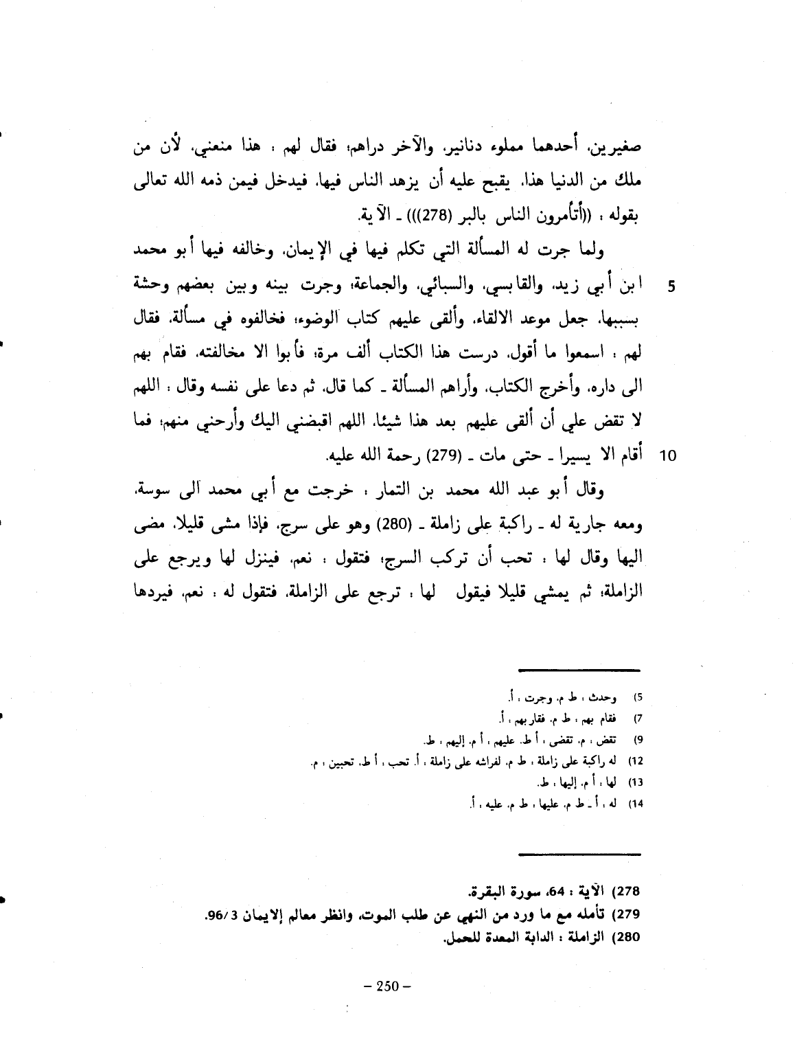 صغيرين، أحدهما مملوء دنانير، والآخر دراهم. فقال لهم: هذا منعني. لأن من ملك من الدنيا هذا يقبح عليه أن يزهد الناس فيها. فيدخل فيمن ذمه الله تعالى بقوله تعالى: " أتأمرون الناس بالبرّ " الآية. ولما جرت له المسألة التي تكلم فيها في الإيمان، وخالفه أبو محمد ابن أبي زيد رحمه الله، والقابسي، والسبائي، والجماعة رضي الله عنهم. وحدث بينهم وبين بعضهم وحشة بسببها، جعل موعداً للإلقاء. وألقى عليهم كتاب الوضوء. فخالفوه في مسألة. فقال لهم: اسمعوا ما أقول: درست هذا الكتاب ألف مرة. فأبوا إلا مخالفته. فقام بهم الى داره، وأخرج الكتاب وأراهم المسألة، كما قال. ثم دعا على نفسه. وقال: اللهم لا تقض عليّ أن ألقي عليهم بعد هذا شيئاً. اللهم أقبضني إليك، وأرحني منهم. فما قام إلا يسيراً حتى مات رحمه الله. وقال أبو عبد الله محمد بن التمار: خرجت مع أبي عبد الله الى سوسة، ومعه جارية له راكبة على زاملة. وهو على سرج. فإذا مشى قليلاً، مضى إليها. وقال: تحبين أن تركبي السرج؟ فتقول نعم: فينزل لها ويرجع على الزاملة. ثم يمشي قليلاً فيقول لها: ترجعي الى الزاملة؟ فتقول نعم. فيردها
