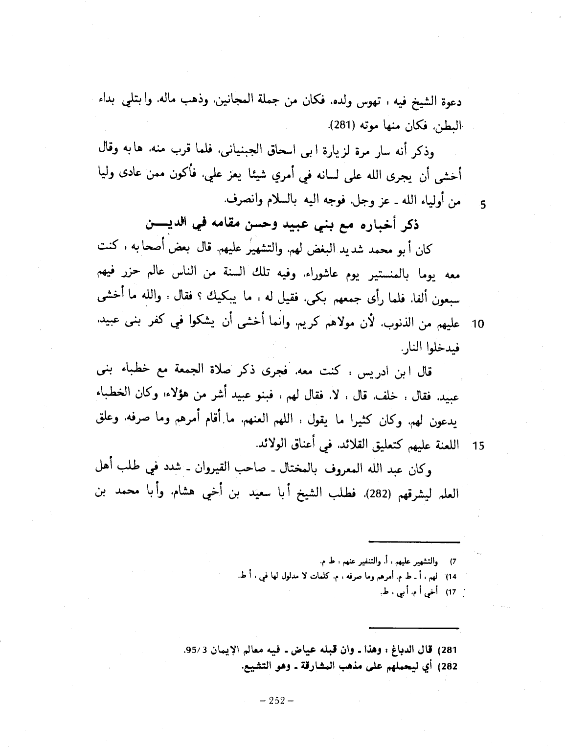 كان أبو محمد شديد التنقيض لهم والتنير عنهم. قال بعض أصحابه: كنت معه يوماً بالمنستير، وكان يوم عاشوراً. فلما رأى بكى. فقيل له ما يبكيك؟ فقال والله ما أخشى عليهم من الذنوب، لأن مولاهم كريم، وإنما أخشى أن يشكّوا في كفر بني عبيد، فيدخلوا النار. قال ابن ادريس: كنت معه، فجرى ذكر صلاة الجمعة مع خطباء بني عبيد، فقال خلف. قال: لا. قيل له بنو عبيد أشرّ من هؤلاء. وكان الخطباء يدعون لهم، وكان كثيراً ما يقول: اللهم العنهم، ما أقام أمرهم، وما صرفه، وعلّق اللعنة عليهم، كتعليق القلائد في أعناق الولائد. وكان عبد الله المعروف بالمحتال، صاحب القيروان، شدّ في طلب أهل العم، ليشرّقهم، فطلب الشيخ أبا سعيد ابن أخي هشام. وأبا محمد