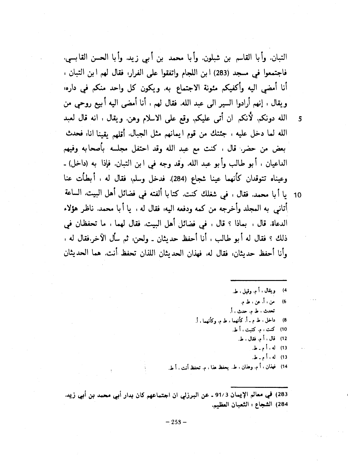 التبّان وأبا القاسم بن شبلون، وأبا محمد ابن أبي زيد، وأبا الحسن القابسي، رضي الله عنهم. فاجتمعوا في مسجد ابن اللجام واتفقوا على الفرار. فقال لهم ابن التبان: أنا أمضي إليه، وأكفيكم مؤونة الاجتماع، ويكون كل واحد منكم في داره. ويقال إنهم أرادوا السير الى عبد الله. فقال لهم: أنا أمضي إليه، أبيع روحي من الله دونكم، لأنكم إن أتي عليكم، وقع على الإسلام وهن. ويقال إنه قال لعبد الله: لما دخل عليه جئتك عن قوم إيمانهم مثل الجبال، أقلّهم يقيناً أنا. فحدث بعض من حضر، قال: كنت مع عبد الله، وقد احتفل مجلسه بأصحابه، وفيهم الداعيان: أبو طالب، وأبو عبد الله. لعنهم الله. وقد وجه الى ابن التبان، فإذا به داخل، وعيناه توقدان، كأنهما عينا شجاع. فدخل وسلم. فقال: أبطأت عنا يا أبا محمد. فقال: في شغلك، كتاب ألفته في فضائل أهل البيت الساعة. أتاني به المجلد، ودفعه إليّ. فقال: يا أبا محمد ناظر هؤلاء الدعاة. قال: في ماذا؟ قال في فضائل أهل البيت. فقال لهما: ما تحفظان في ذلك. فقال له أبو طالب: أنا أحفظ حديثان - ولحن - ثم سأل الآخر، فقال له: وأنا أحفظ حديثان. فقال فيما ذان الحديثان