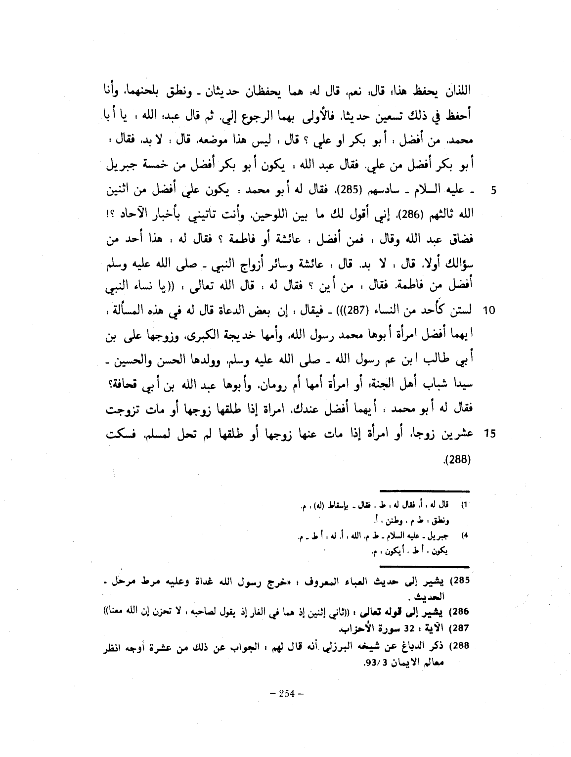 اللذان تحفظ أنت؟ فقال له: هما يحفظان حديثان - ونطق بلحنهما - وأنا أحفظ في ذلك تسعين حديثاً، فأولى بهما الرجوع إلي. ثم قال عبد الله: يا أبا محمد، من أفضل أبو بكر أو عليّ؟ قال: ليس هذا موضعه. فقال: لابد، فقال: أبو بكر أفضل من علي. فقال عبد الله: أيكون أبو بكر أفضل من خمسة، جبريل عليه السلام سادسهم؟ فقال أبو محمد: أيكون عليّ أفضل من اثنين، الله ثالثهما؟ إني أقول لك ما بين الوجهين، وأنت تأتيني بأخبار الآحاد. فضاق عبد الله، وقال: فمن أفضل عائشة أو فاطمة. فقال له: هذا آخر، سؤالك الأول؟ قال: لابد. قال: عائشة رضي الله عنها، وسائر أزواج النبي صلى الله عليه وسلم أفضل من فاطمة. قال: من أين؟ فقال له قال الله تعالى: " يا نساءَ النبيّ لستنّ كأحدٍ من النساء، إن اتقيتُنّ. فيقال، إن بعض الدعاة قال له في هذه المسألة. أيما أفضل، امرأة أبوها رسول الله، صلى الله عليه وسلم، وأمها خديجة الكبرى، وزوجها علي بن أبي طالب ابن عم رسول الله صلى الله عليه وسلم، وولداها الحسن والحسين، سيدا شباب أهل الجنة. أو امأة، أمها أم رومان وأبوها عبد الله ابن أبي قحافة؟ فقال له أبو محمد: أيهما أفضل عندك، امرأة إذا طلقها زوجها، أو مات عنها تزوجها عشرون زوجاً؟ أو امرأة إذا مات عنها زوجها أو طلقها لم تحل لأحد؟