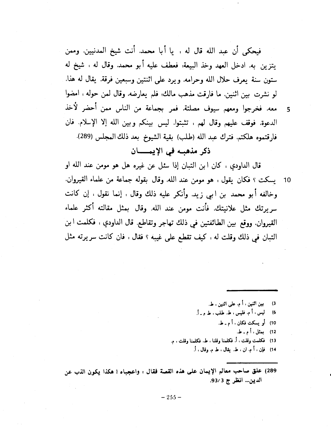 قال الداودي: كان ابن التبّان إذا سئل عن غيره، هل يقول: هو مؤمن عند الله، أو يسكت. فكان يقول: هو مؤمن عند الله. وقال بقوله جماعة من علماء القيروان. وخالفه أبو محمد بن أبي زيد رحمه الله. وأنكر عليه ذلك. وقال: إنما يقول، إن كانت سريرتك، مثل علانيتك، فأنت مؤمن عند الله. وقال بمثل مقالته، أكثر علماء القيروان. ووقع بين الطائفتين في ذلك تهاجر، وتقاطع. قال الداودي: فكلمنا ابن التبّان في ذلك، وقلت له: كيف نقطع على غيبة؟ فقال: فإن كانت سريرته مثل