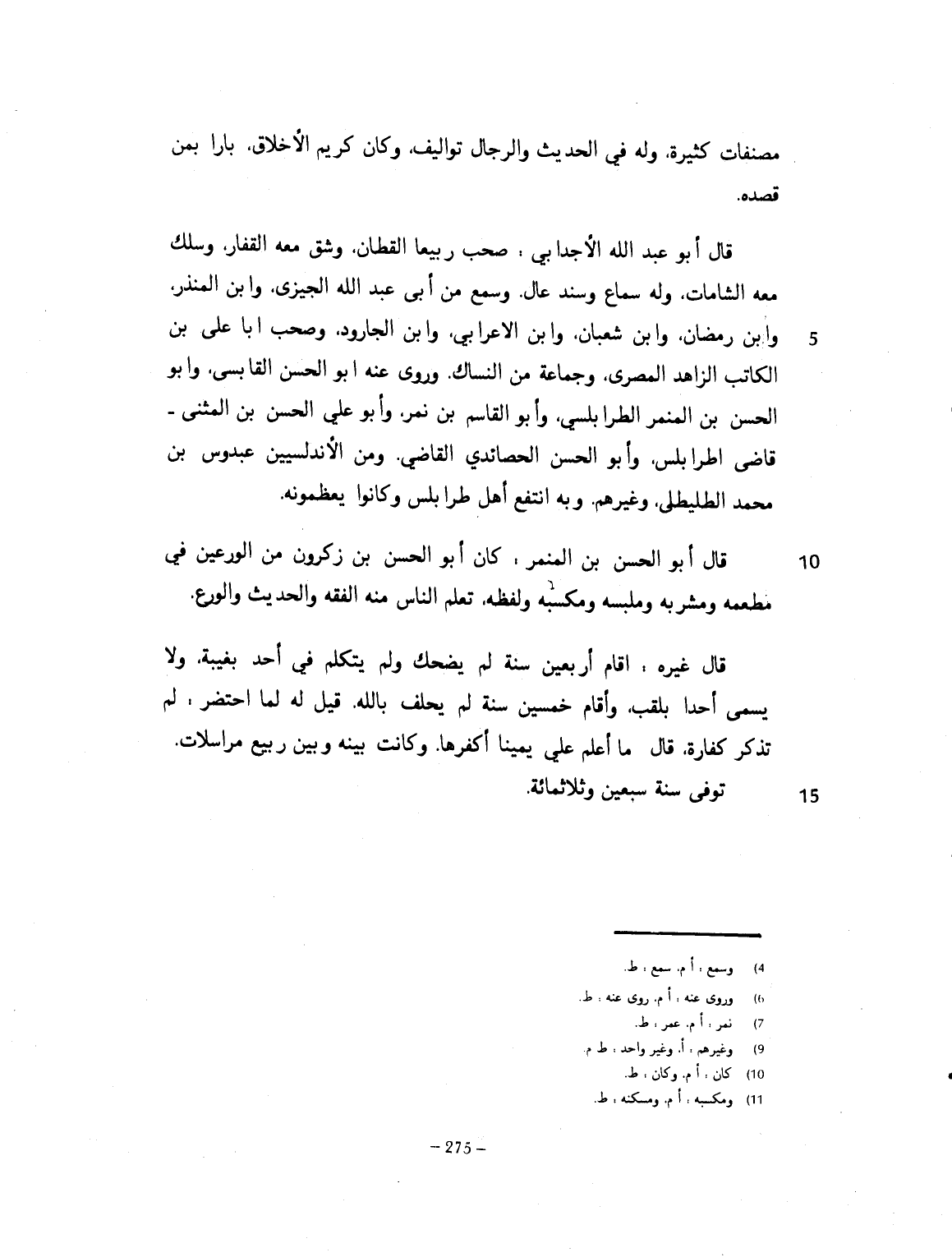 والعبادة والتواضع. سريع الدمعة، رفيق الطالب. أخذ الناس عنه من سنة ثلاثين وثلاثماية، الى سنة تسع وخمسين. ثم منع السماع، ورعاً لما دخله من السنين. وكان الجبنياني يحبه، ويثني عليه ويعظمه. وقال الجبنياني للقابسي: أو ليس عندكم أبو الحسن الدباغ؟ وددت لو أن وسادتي في عتبة باب أبي الحسن الدباغ. ما يكلمه أحد إلا احمر لونه، ولقد كان أحيا من الأبْكار. وقدم رجل من أهل الشرق، فسمع الناس يقولن: أبو الحسن الدباغ الفقيه، وأبو إسحاق السبائي العابد. فقال لهم: بل العابد أبو الحسن، والعالم البحر أبو إسحاق. قال أبو إسحاق: كان يخيل إليّ أن صاحب الشمال، لا يكتب عن أبي الحسن لطهارة قلبه، وعفة بطنه. وكان من أهل التحقيق في معاني الولايات.