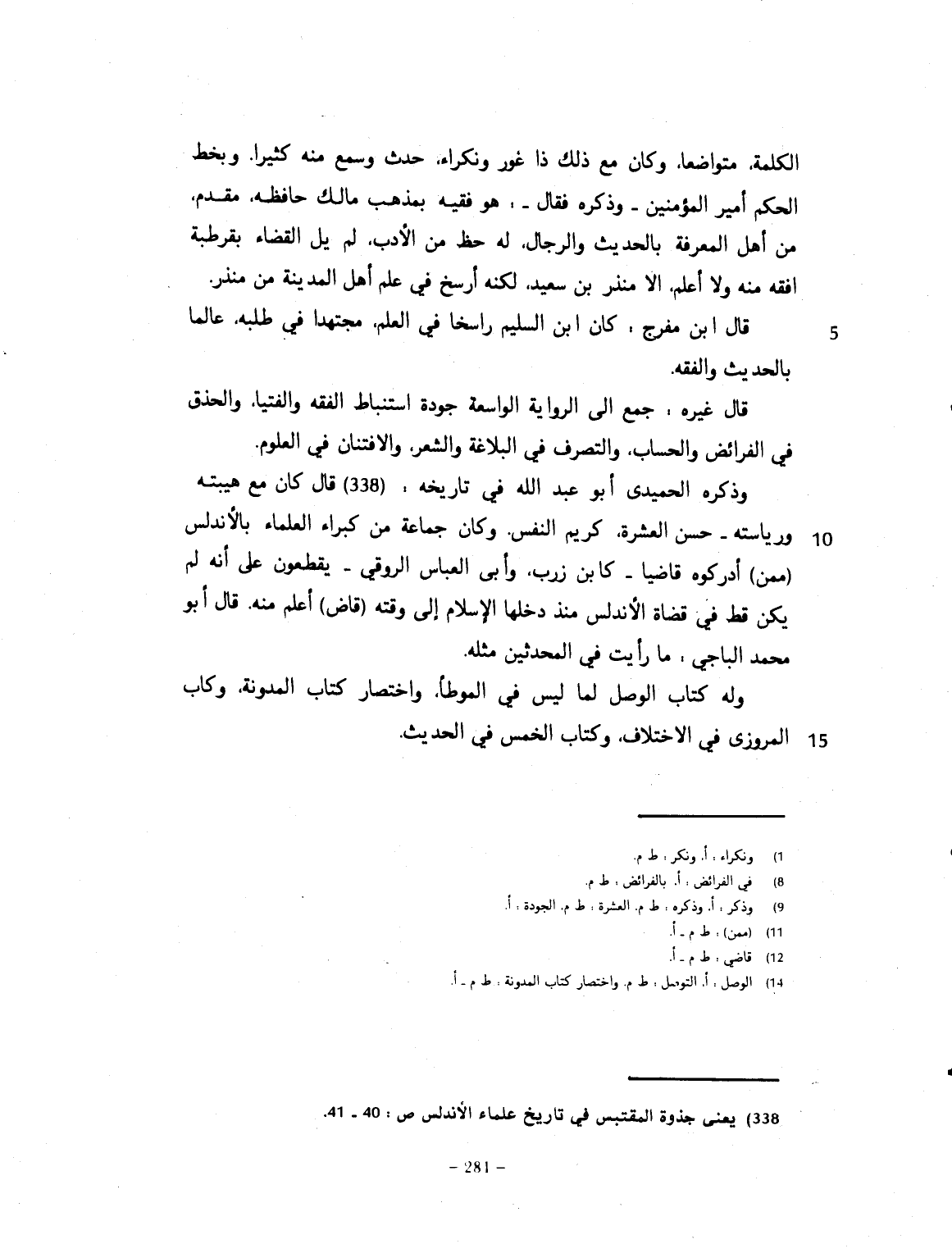 ولم يفسح له. وجلس على الماجل. وقرأ الوثيقة، أبو محمد الشقيقي، غيظك على هؤلاء، ترده عليّ؟ أنا قلت لك أقعد على الماجل؟ قال ابن حارث: وأبو الأزهر هذا حافظ فقيه، موثوق به، لزم بيته لما حدث من غلط الزمان. وقد ذكرنا أنه كان يحلق بجامع القيروان، أيام أبي يزيد رحمه الله، مع ابن أخي هشا، وابن أبي زيد، وغيرهم. وتوفي رحمه الله، سنة إحدى أو اثنتين وتسعين وثلاثماية. ويقال سنة ثمان وستين.