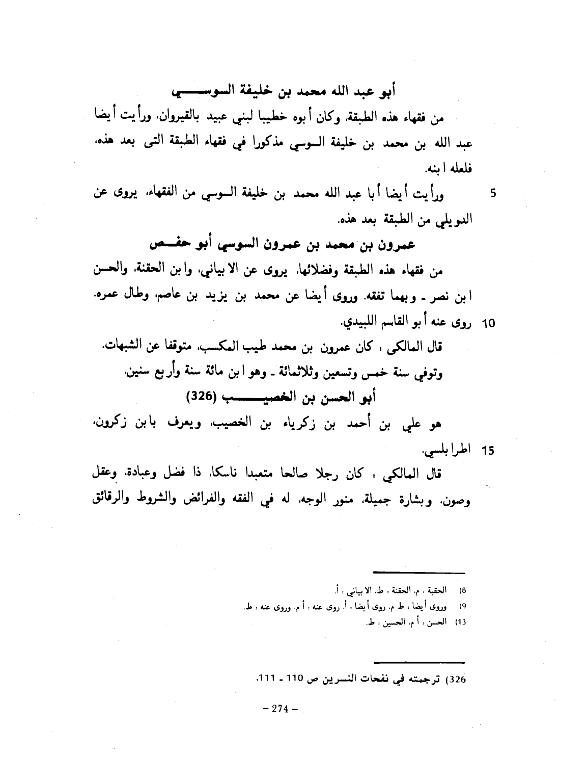 من فقهاء هذه الطبقة. وكان أبوه خطب لبني عبيد بالقيروان. ورأيت أيضاً عبد الله بن محمد بن خليفة السوسي، مذكوراً في فقهاء الطبقة التي بعد هذه، فلعله ابنه. ورأيت أيضاً عبد الله محمد بن خليفة السوسي من الفقهاء، يروي عن الدويلي، من الطبقة بعد هذه. رحمه الله.