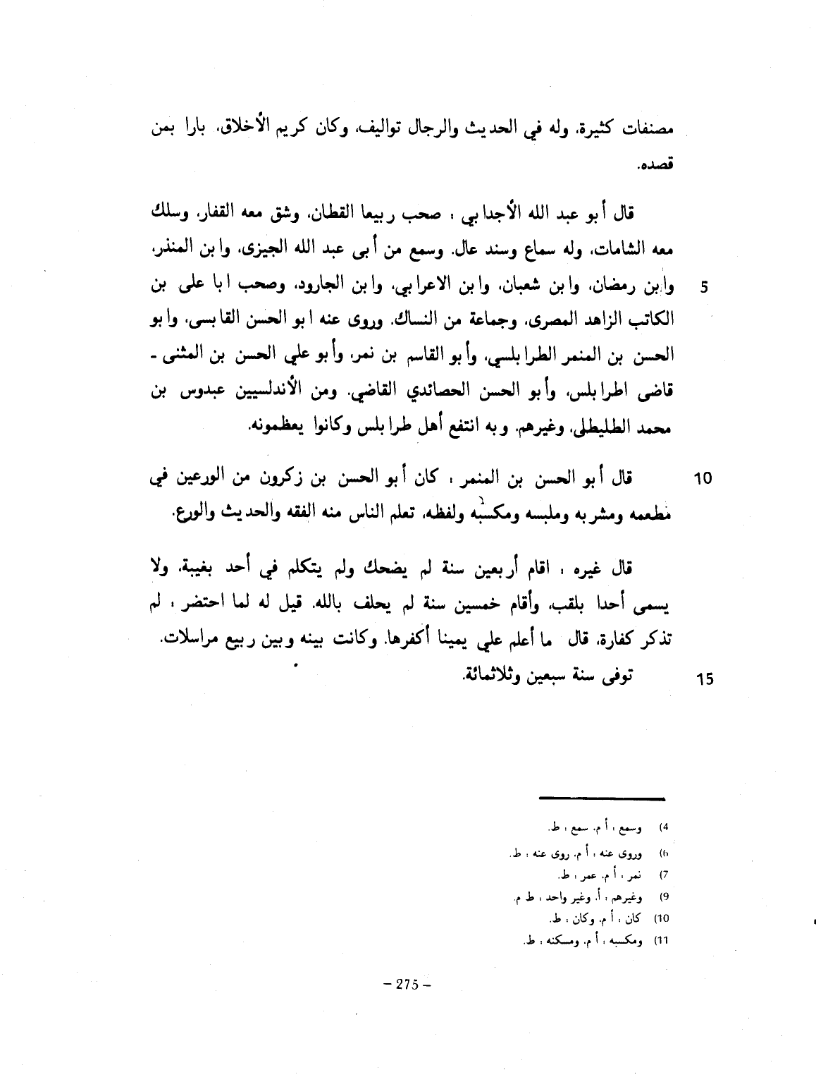 مصنفات كثيرة. وله في الحديث والرجاء تواليف. وكان كريم الأخلاق باراً بمن قصده. قال أبو عبد الله الأجدابي: صحب رفيق القطان، وشقّ معه القفار، وسال معه الشامات، وله سمات وسند عال. وسمع من أبي عبد الله الجيري، وابن المنذر، وابن رمضان، وابن شعبان، وابن الأعرابي، وابن الجارود. وصحب أبا علي بن الكاتب الزاهد المصري. وجماعة من النسّاك، وروى عنه أبو الحسن القابسي، وأبو الحسن بن النمر الطرابلسي. وأبو القاسم بن نمر. وأبو علي بن المثنى، قاضي طرابلس. وأبو الحسن الحصائري الفارضي. رضي الله عنهم أجمعين. ومن أهل الأندلس عبدوس بن محمد الطليطلي وغير واحد، وبه انتفع أهل طرابلس. وكانوا يعلمونه. قال أبو الحسن بن النمر: كان أبو الحسن بن ذكرون من الورعين، في مطعمه ومشربه وملبسه، ومكسبه، ولفظه، تعلم الناس منه الفقه والحديث والورع، قال غيره: أقام أربعين سنة لم يضحك، ولم يتكلم في غيبة أحد، ولا يسمي أحداً بلقب، وأقام خمسين سنة، لم يحلف بالله. قيل له لما احتضر أتذكر كفارة؟ قال: أعلم ما عليّ يمين أكفرها. وكانت بينه وبين ربيع، مراسلات. توفي سنة سبعين وثلاثماية.