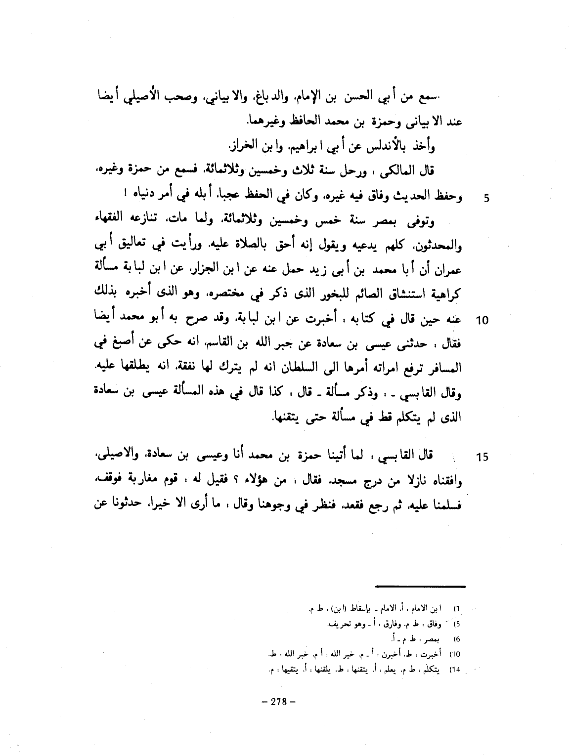 سمع من أبي الحسن الإمام، والدبّاغ والإبياني، وصحب الأصيلي أيضاً عند الإبياني، وحمزة بن محمد الحافظ وغيرهما. وأخذ بالأندلس عن أبي ابراهيم، وابن الخراز. قال المالكي: رحل سنة ثلاث وثلاثماية. فسمع من حمزة وغيره. وحفظ الحديث، وفاق فيه غيره. وكان في الحفظ عجباً. أبله في أمر دنياه. وتوفي بمصر سنة خمس وخمسين وثلاثماية. ولما مات تنازعت الفقهاء والمحدّثون، كلهم يدعيه، ويقول: أنا أحق بالصلاة عليه. ورأيت في تعاليق أبي عمران، أن أبا محمد، حمل عنه عن أبي الجزار، عن ابن لبابة، مسألة كراهة استنشاق الصائم للبخور، الذي ذكر في مختصره. وهو الذي أخبره بذلك، عن ابن لبابة. وقد صرح به، أبو محمد أيضاً. فقال: حدثني عيسى بن سعادة عن خير الله بن قاسم، أنه حكى عن أصبغ في امرأة المسافر، ترفع أمرها الى السلطان، أنه لم يترك لها نفقة، أنه يطلقها عليه. قال القابسي: وذكر مسألة فقال: كذا قال في هذه المسألة، عيسى بن سعادة، الذي ما تكلم قط في مسألة حتى يتقنها. قال القابسي: لما أتينا حمزة بن محمد أنا وعيسى بن سعادة والأصيلي، وافقناه نازلاً من درج مسجد. فقال من هؤلاء؟ فقيل له قوم مغاربة. فوقف، فسلمنا عليه. ثم رجع فقعد، فنظر في وجوهنا وقال: ما أرى إلا خيراً. حدثونا عن