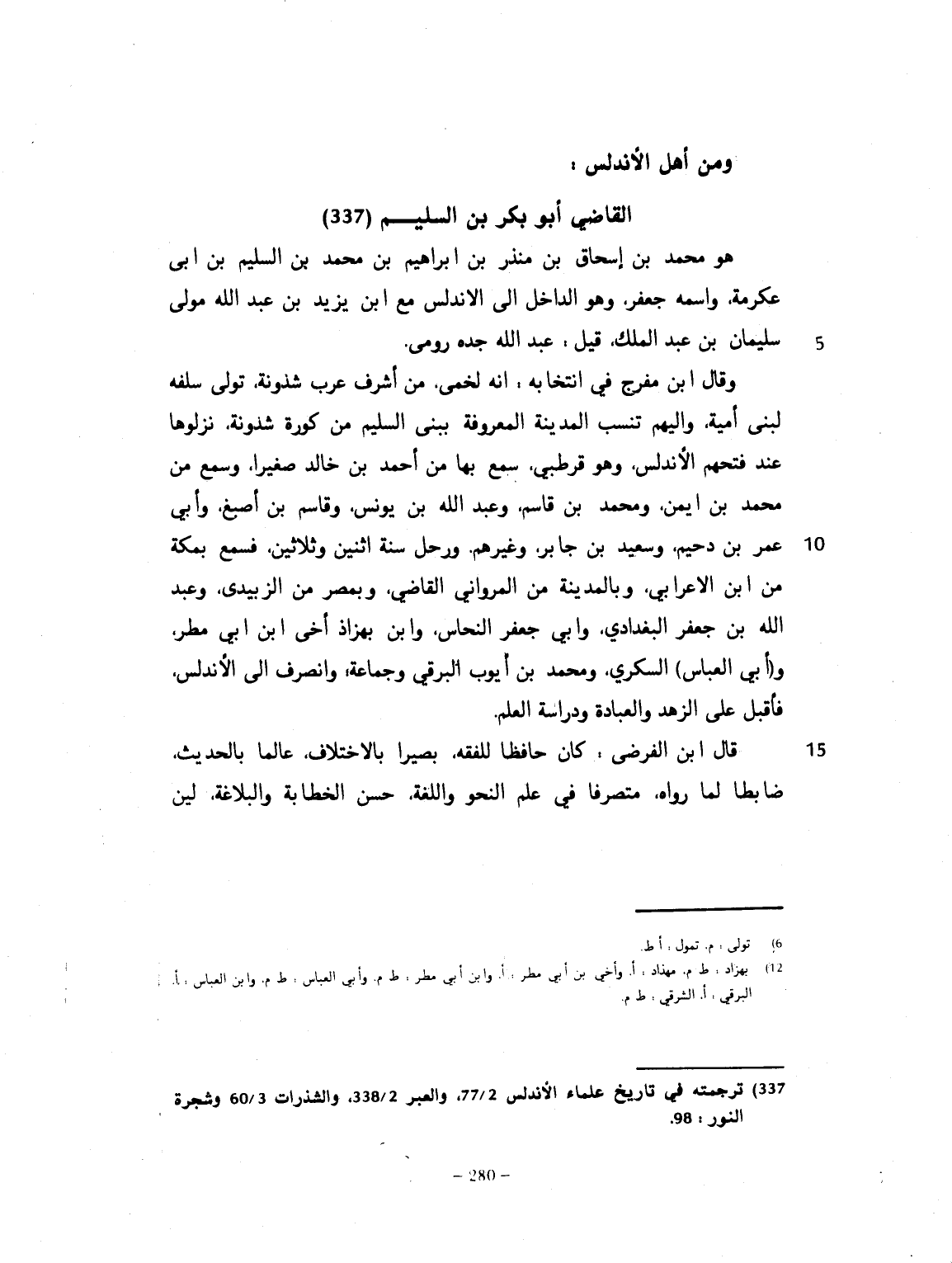 هو محمد بن إسحاق بن منذر بن محمد بن ابراهيم بن محمد بن السليم، ابن أبي عكرمة، واسمه جعفر - وهو الداخل الى الأندلس - ابن يزيد بن عبد الله، مولى سليمان بن عبد الملك. قيل إن عبد الله جده، رومي. وقال ابن مفرج في انتسابه: إنه لخمي من أشراف كورة شذونة. تولى سلفه لبني أمية، وإليهم تنسب المدينة المعروفة ببني السليم، من كورة شذونة. نزلوها عند فتحهم الأندلس، وهو قرطبي. سمع بها من أحمد بن خالد صغيراً، ومحمد بن أيمن، ومحمد بن قاسم، وعبد الله بن يونس، وقاسم بن أصبغ، وأبي عمر بن دحيم، وسعيد بن جابر، وغيرهم. ورحل سنة اثنتين وثلاثين. فسمع بمكة من ابن الأعرابي، وبالمدينة من المرواني، القاضي. وبمصر من الزبيري، وعبد الله بن جعفر البغدادي، وأبي جعفر النحاس، وابن بهزاذ. وابن أبي مطر، وأبي العباس السكري، ومحمد بن أيوب الرّقي، وجماعة. وانصرف الى الأندلس، فأقبل على الزهد والعبادة ودراسة العلم. قال ابن الفرضي: كان حافظاً للفقه، بصيراً بالاختلاف، عالماً بالحديث، ضابطاً لما رواه، متصرفاً في علم النحو واللغة، حسن الخطابة والبلاغة. لين